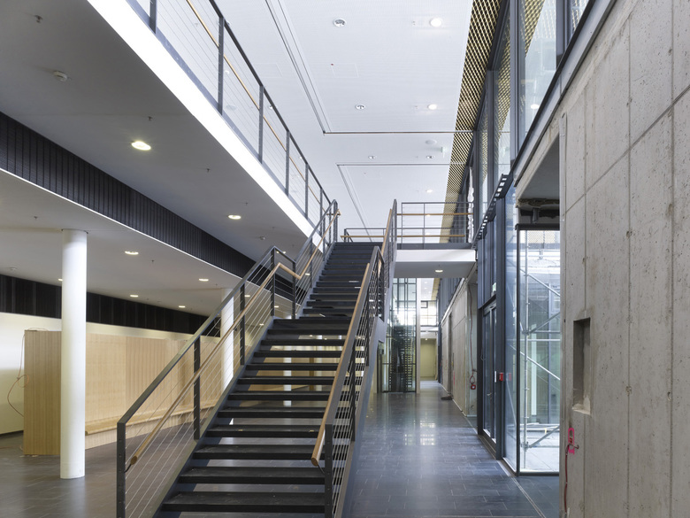 The two-storey foyer forms the backbone of the slender and long building, which accommodates seminar rooms, the library and the cafeteria. Despite the difference in level of 3.50 m the foyer’s two storeys allow for an access at ground level from both of the flanking streets. Six lecture halls are shifted as a base beneath the accessible square clearly reducing the visible building mass. The underground lecture halls receive daylight from the sides via patios, cut into the square.