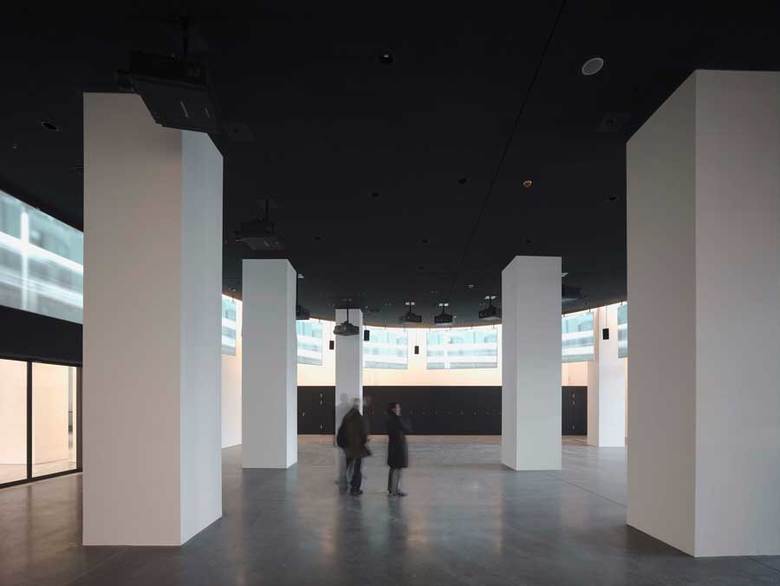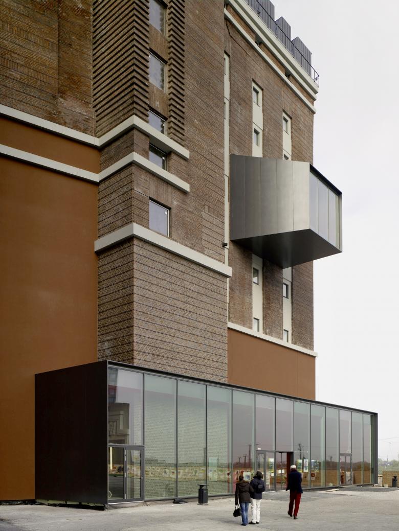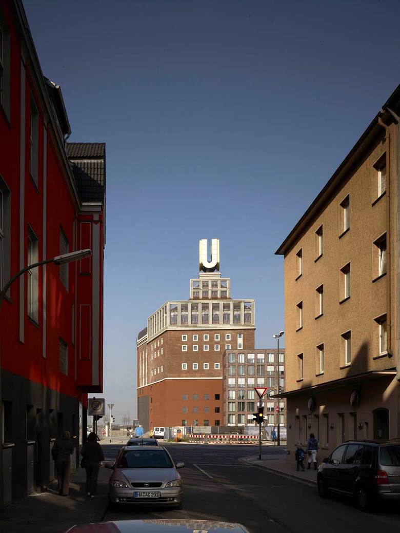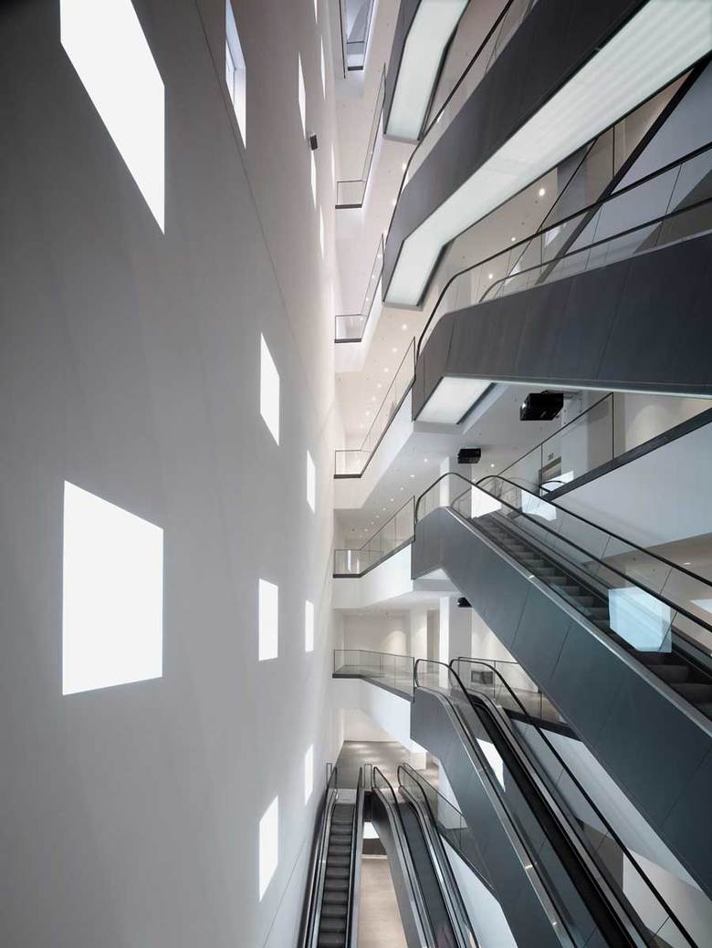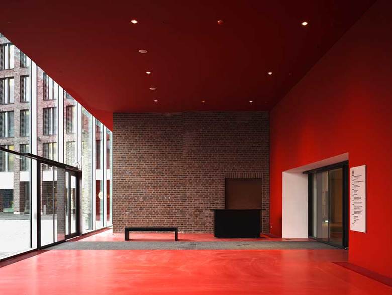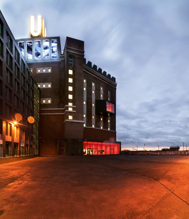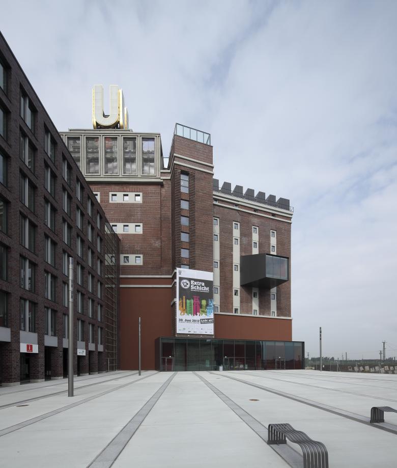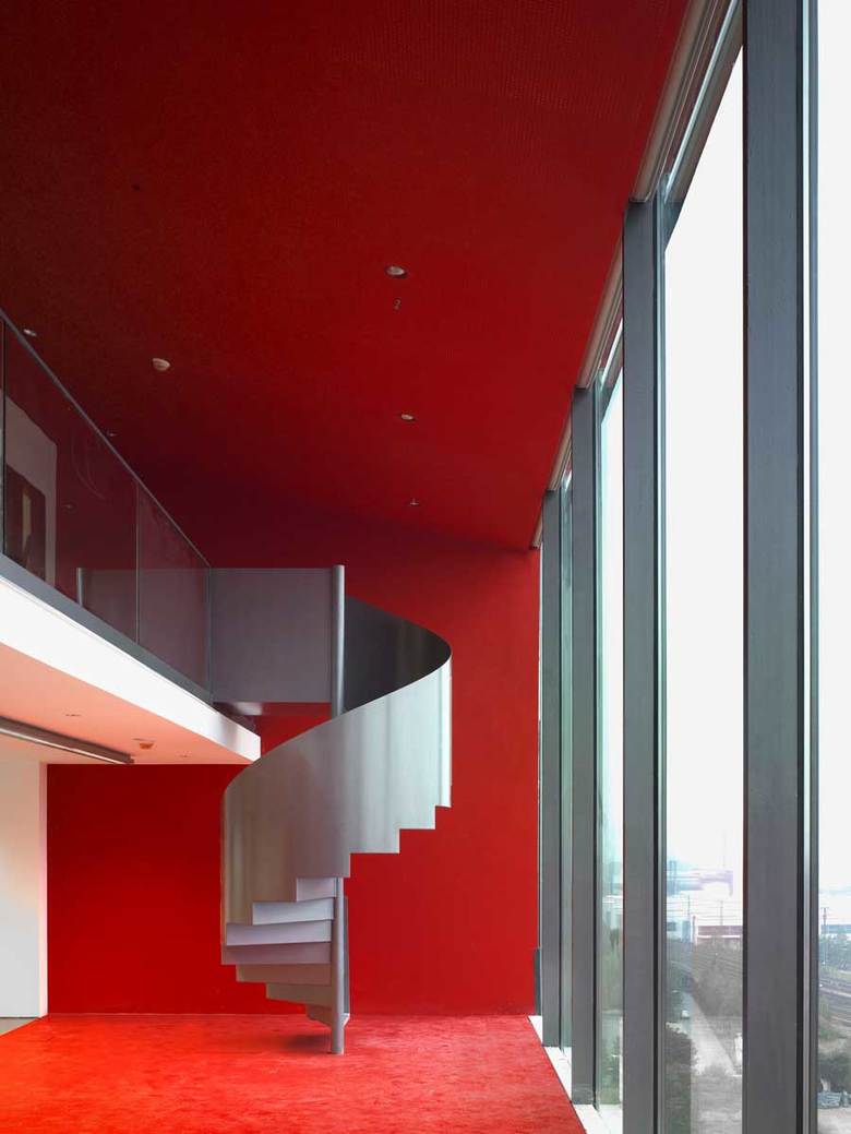 With its new ‘vertical’ – i.e. the ground-to-roof – entrance atrium the size of the U-Tower’s volume (a former part of the Union Brewery) can be fully experienced from inside for the first time. Escalators lead from the ground-floor foyer past all the exhibition levels to the ‘cathedral room’ directly underneath the illuminated ‘U’ sign on top of the tower. Conically contorted, metal-clad cubic shapes penetrate the building from inside out. They appear like counterpoints to the existing red clinker façades and point to the unusual roof shape of the ‘cathedral room’.