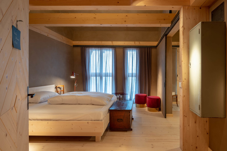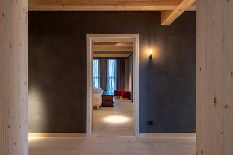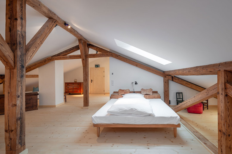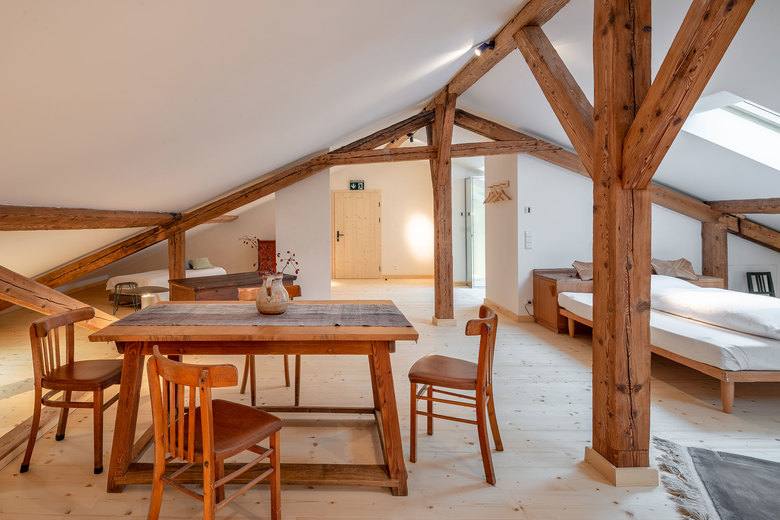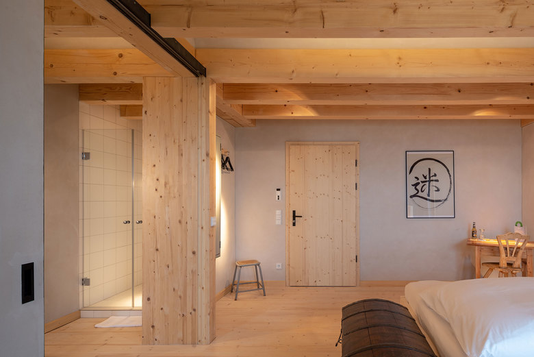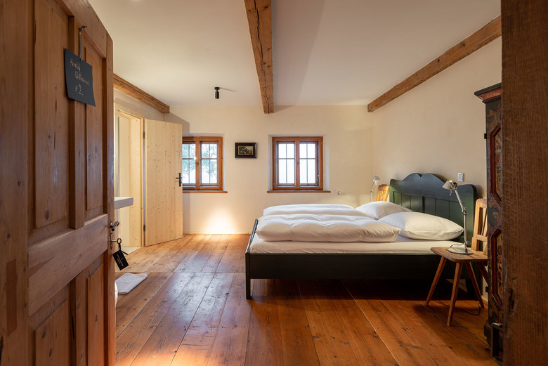 Auf den beiden oberen Ebenen wurden neue komfortable Gästezimmer eingerichtet, die den Blick über Wiesen und den Waldrand bis hin zu den Bergen freigeben. Dielenböden, sichtbare Deckenbalken und traditionelle Bauernmöbel vermitteln in den vier Bauernzimmern und der Bauernsuite eine urige, gemütliche Atmosphäre. Rustikale Bauernbetten und Bauernschränke sowie die neu eingebauten Badezimmer mit Dusche offerieren eine willkommene Auszeit von überfrachteten Alltags-Interieurs. In den vier Stallzimmern strahlt unbehandeltes Fichtenholz eine wohlige Wärme aus. Lehmputz in unterschiedlichen Naturfarben vermittelt Ruhe und Geborgenheit, gleichzeitig schenken große bodenhohe Fenster einen weiten Blick in die Natur. Selbstentworfene Betten aus Fichtenholz und ein per Schiebewand verbundenes Badezimmer mit Dusche wahren einen stillen Komfort.