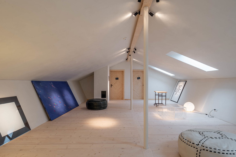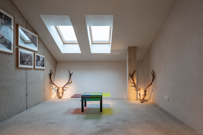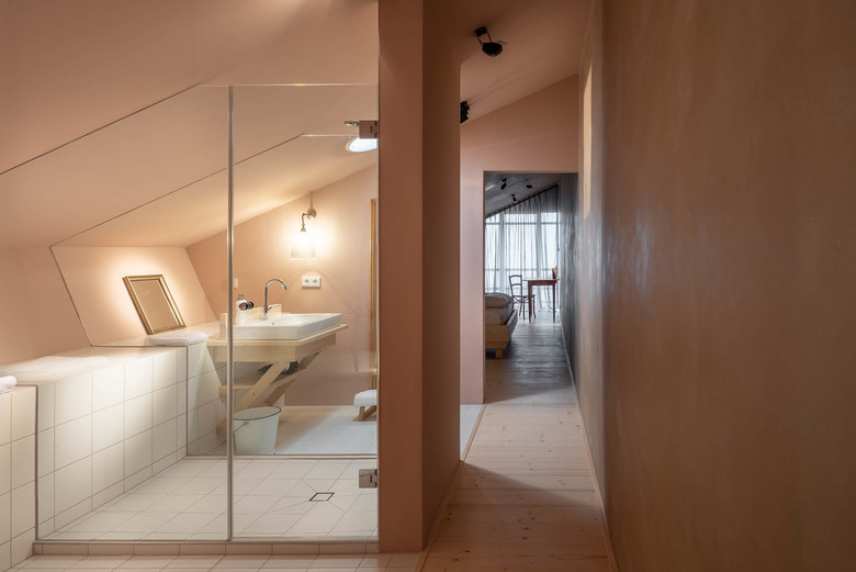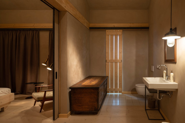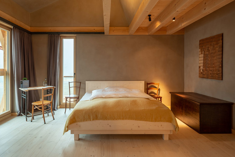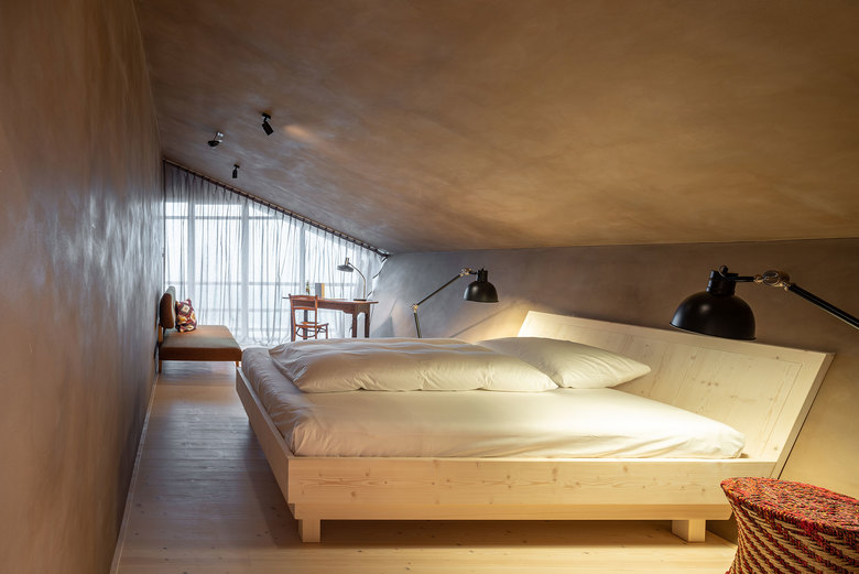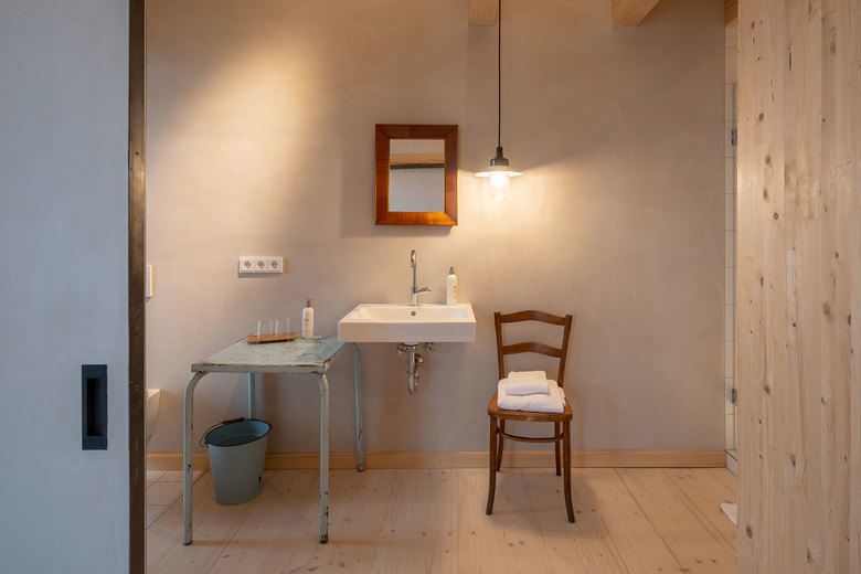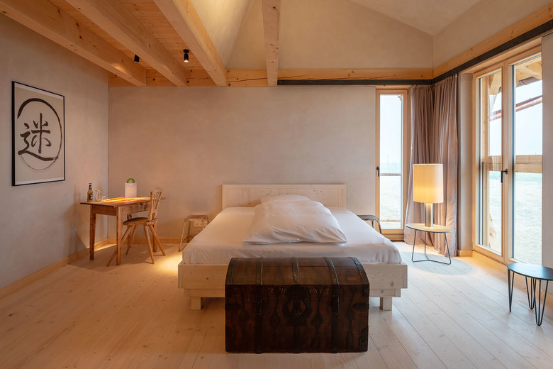 Unbehandeltes Fichtenholz, zu Dämmplatten verarbeitete Jutesäcke, Lehmwände, Lehmputz, schlichte Bauernmöbel und eine faszinierende Lichtstimmung. Das Highlight sind die beiden Stallsuiten im Dachgeschoss. Sie befinden sich direkt unter dem Dach mit seinen eigentümlich geneigten Decken- und Giebelwänden. Eine komplett verglaste Seitenwand am Ende der Suiten scheint den Raum zu öffnen und es entsteht ein Gefühl der Weite und der Einheit mit der Natur. Hier sind die Bäder mit Badewannen ausgestattet. Solitäre Möbel, teils rustikal, teils modern, bieten in allen Räumen Platz für die nötigsten Gebrauchsgegenstände und sind gleichzeitig Kunstobjekt sowie optische Bezugspunkte.