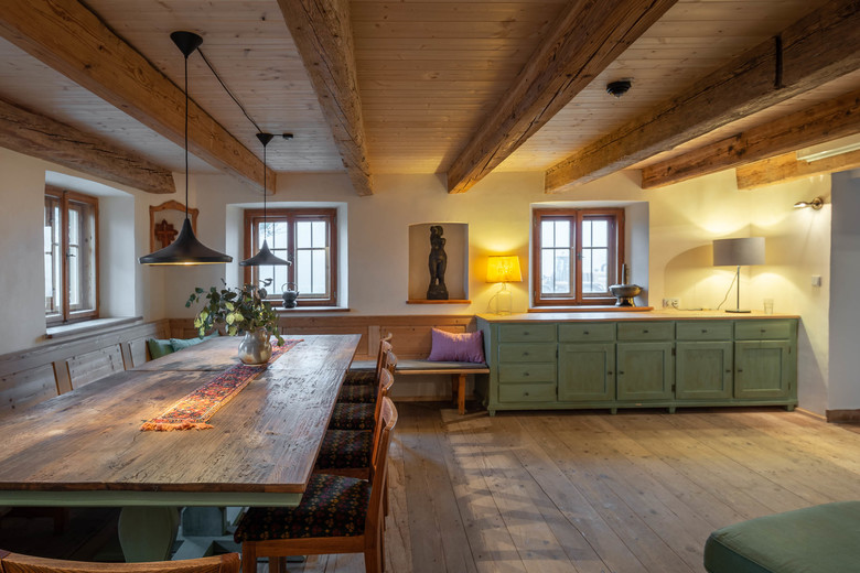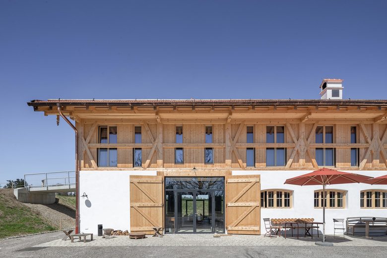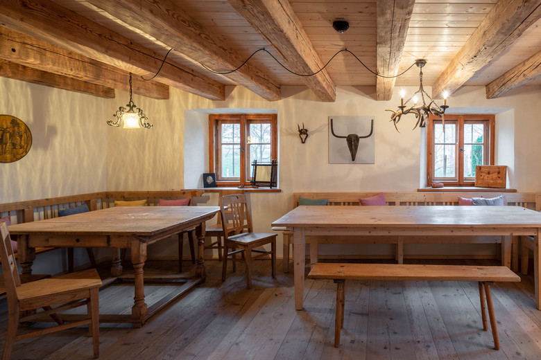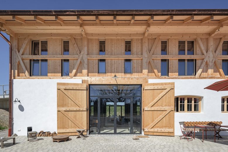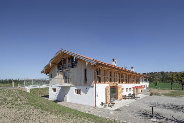 „Respekt für das Alte, also Denkmalschutz, hört nicht beim Renovieren und Bauen auf, sondern umfasst auch die Gestaltung der Räume“, sagt Architekt Stefan Mohr. Deshalb wurde sowohl bei der Bausubstanz als auch bei der Ausgestaltung des Interieurs nichts dem Zufall überlassen. Verantwortlich für die bauliche Umsetzung waren die vonMeierMohr Architekten aus Schondorf am Ammersee. Dass das Bauernhaus heute in neuer Lebendigkeit erstrahlen kann, ist der engen und konstruktiven Zusammenarbeit zwischen Bauherr und Architekten sowie Tragwerksplanern und Denkmalpflegern aber auch ortsansässigen Handwerksbetrieben mit deren Wissen über alte Konstruktionen und Bauweisen zu verdanken. Unter Einhaltung der entsprechenden Auflagen konnte der Wiederaufbau des Stalltraktes zügig und ganz nach den Wünschen des Bauherrn vonstattengehen. Eines der augenscheinlichsten Zeugnisse des Original Bauwerks ist sicherlich das von regionalen Gewerken wiederhergestellte kunstvolle Bundwerk an der Fassade, das die bäuerliche Baukultur des Voralpenlandes repräsentiert. Innen wiederum erinnert der rötlich eingefärbte Estrich an das einstige Mauerwerk aus Ziegel und verleiht dem Raum eine bodenständige, authentische Atmosphäre. Bei der Restauration des Bauernhauses wurde der Nachhaltigkeitsgedanke bis ins kleinste Detail umgesetzt. Nach zweijähriger Planungs- und Bauzeit steht es heute vorzugsweise für exklusive Tagungen sowie für individuelle Urlaube in einer idyllischen Natur zur Verfügung. Fernab von Lärm und Hektik der Großstadt genießen Gäste hier eine sinnliche Küche voller frischer Zutaten aus eigenem Anbau, ökologisch und verantwortungsbewusst nicht nur der Natur, sondern auch den Menschen gegenüber.