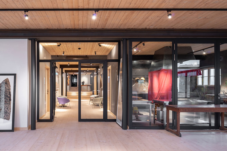 In enger Zusammenarbeit zwischen Bauherren, Architekten, Statikern und Denkmalpflegern sowie ortsansässigen Handwerksbetrieben wurde das historische Gebäude in liebevoller Detailarbeit zu neuem Leben erweckt und so präsentiert sich das restaurierte Bauernhaus heute wie Phönix aus der Asche. Originalgetreu erstreckt es sich über insgesamt drei Ebenen. Der Farmers Club im Erdgeschoss ist ein offener Gemeinschaftsraum für Veranstaltungen, Bar und Kunstgalerie in Einem. Bis zu 80 Personen finden darin Platz für ausgelassene Festlichkeiten, vom kulturellen Event über Geburtstagsfeiern bis hin zur feierlichen Hochzeit. Viele wohlgeplante Brüche machen das Interieur lebendig ohne zu überfrachten. Naturmaterialien wie Holz, Ziegel und Lehm bilden eine erdige Bausubstanz, expressive Kunst, Glaselemente und viel Licht bringen modernen Flair ins Spiel. Die ehemaligen Stalltore sind heute verglast und geben den Blick frei auf die Gartenlandschaft der ehemaligen Schafweide, hin zu den großen Walnussbäumen und weiter bis in das Tegernseer Voralpenland. Durch zwei große Flügeltore gelangt man in die ‚Feuerküche’. Zwei Feuerstellen wie Anno Dazumal, eine davon offen, die andere geschlossen, verbreiten einen urigen Charme. Hier wird gekocht, gebacken, gebraten und geräuchert. Der historische Wohnteil des Bauernhauses wurde originalgetreu wiederhergestellt. In der großen Stube mit offener Küche wird gemütlich zusammen gesessen – ob tagsüber, abends nach einer Feier oder am Morgen zum Landfrühstück.