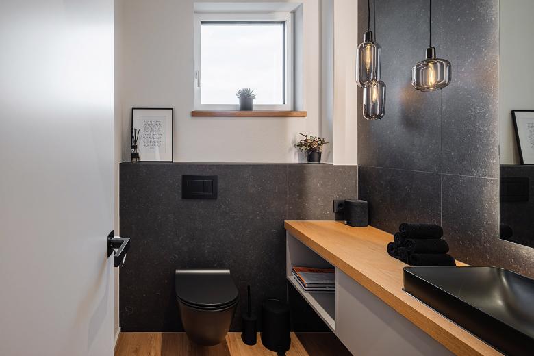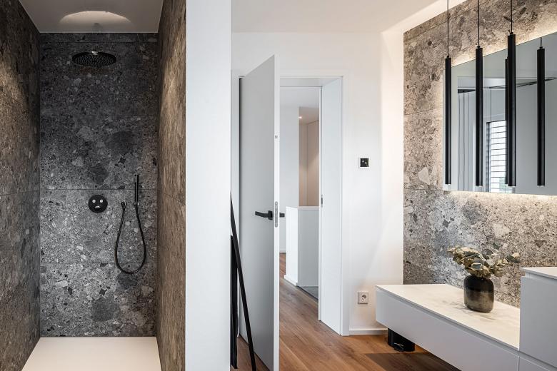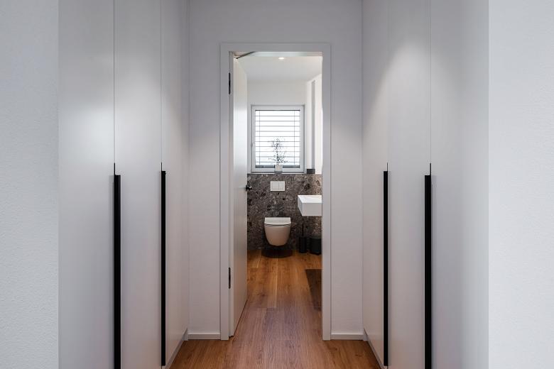 Doch ein Wohnhaus muss natürlich nicht nur einer bestimmten Ästhetik folgen, sondern vor allem auch gewisse Funktionalitäten erfüllen. Im Falle des Dillinger Einfamilienhauses waren vom Bauherrn neben den klassischen Bereichen wie Küche, Bad und Wohnraum zwei Kinderzimmer gewünscht, die im Erdgeschoss situiert sind. Ein separater Elternbereich beinhaltet das Schlafzimmer, ein eigenes Ankleidezimmer sowie ein Badezimmer. Um auch zukünftig ortsunabhängig arbeiten zu können, wurde die Option für das Homeoffice berücksichtigt und ein entsprechender Bereich im Keller eingerichtet, wo sich außerdem ein Hobbyraum mit Fitnessgeräten und Sauna befindet.