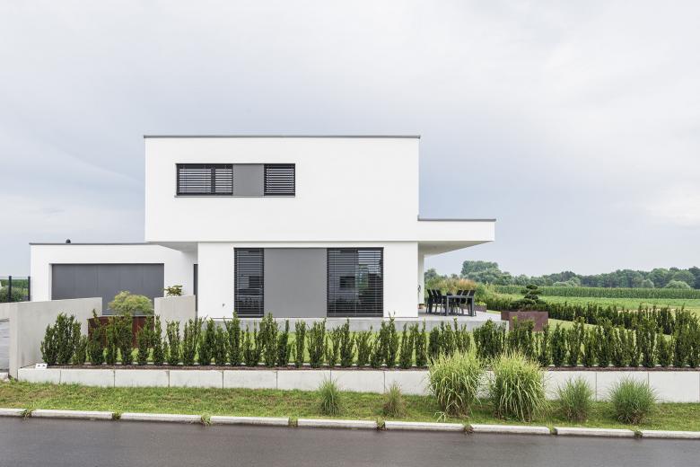 Mit Erdgeschoss und Obergeschoss kommt der modern ausgearbeitete, kubistische Bau auf insgesamt 174 Quadratmeter Wohnfläche, bei einer Bruttogrundfläche von 153 Quadratmetern. Im Keller befinden sich auf 46 Quadratmetern Hobbyraum und Büro. Die Garage bietet mit 60 Quadratmetern genügend Platz für KFZ, Fahrrad, Gartengeräte und Kinderspielzeug. Die moderne Raumkubatur besticht dabei durch einen äußerst effizienten Gebäudeschnitt, eine intelligente Raumaufteilung und den entsprechenden Grundriss.