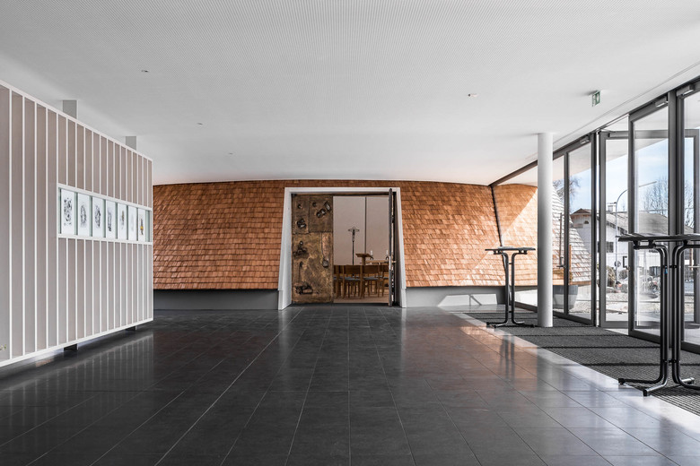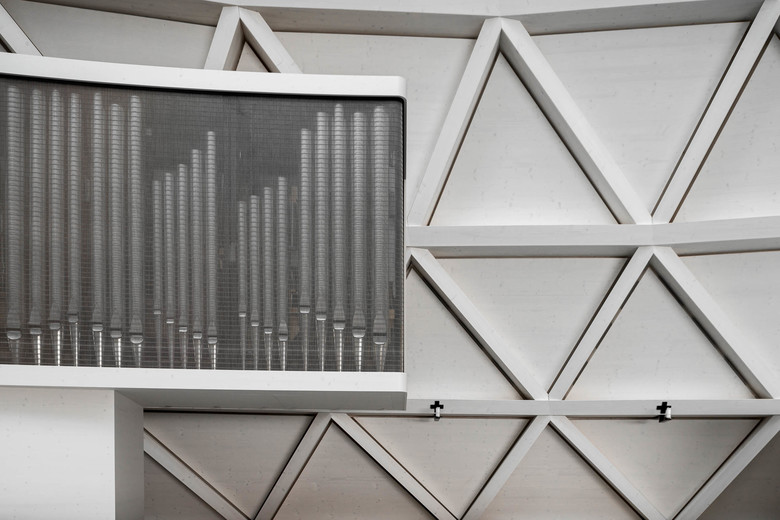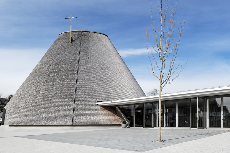 Das neue Kirchenzentrum besteht aus einer mächtigen Rundkirche mit kleiner Kapelle und dem Kirchturm des Vorgängerbaus. Kirche und Kapelle wurden als leicht nach hinten gekippte Ovalkegel in unterschiedlichen Größen ausgeführt. Der elliptische Grundriss mit 32 unterschiedlichen Achsen und Winkelabweichungen stellte Planer und Konstrukteure dabei vor einige Herausforderungen, da keine standardisierten Schalungen under Schallehren verwendet werden konnten. Beide Kegel sind gekappt, der größere in 22 Metern, der kleinere in elf Metern Höhe. Die Stümpfe wurden mit Plexiglasdecken versehen und dienen so als große ovale Lichtöffnungen. Acht mal zwölf Meter misst sie in der großen Kirche. Das einfallende Tageslicht füllt die Innenräume mit einer schattenlosen Helligkeit. Im Querschnitt betrachtet nehmen sie einerseits die Schwünge des Alpenpanoramas auf und vermitteln gleichzeitig einen archaisch-organischen Eindruck. Die ausschließlich aus Holz gefertigte Konstruktion wurde als Dreiecksfachwerk konzipiert. Die Planer berechneten digital die einzelnen Polygone, die dann als Fertigelemente im Leimbinderbau montiert wurden. In zehn Ringen wächst die Kirche nach oben. Die schrägen Sparren führen den Blick des Betrachters hin zum Licht, das durch die Plexiglaskuppeln Kirche und Kapelle erhellt. Die Konstruktion aus sich nach oben hin verjüngenden Balkendreiecken ist gut sichtbar und fungiert gleichzeitig als rhythmisierendes Element. Im Innern entsteht dadurch die Atmosphäre eines riesengroßen Zeltes, das gleichzeitig Leichtigkeit und Geborgenheit vermittelt. Auch von außen ragen Kirche und Kapelle wie zwei Zelte in den Himmel, am Boden sind sie über die Sakristei und das Foyer verbunden. Auf der Grundfläche von insgesamt 850 Quadratmetern finden 479 Gläubige Platz für Gebet, Andacht und Begegnung.