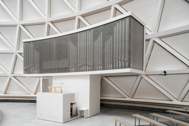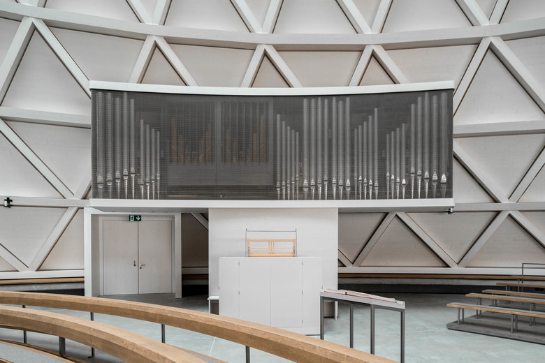 Der saalartigen Kirchenraum wurde im Sinne des zweiten Vatikanums, das auch als 21. Ökumenisches Konzil angesehen wird, liturgisch gestaltet. Vor allem der Dialog, auch mit anderen Glaubensgemeinschaften, steht demnach im Mittelpunkt, die Anpassung an die Gegenwart aber auch Treue zur Tradition. Das Zentrum des Raums bildet die ovale Altarinsel. Um sie ziehen sich die Sitzbänke in konzentrischen Kreisen. Gemeinsam mit der schreinartig neu gefassten Orgel vermittelt das Ensemble eine große Harmonie. Durch die Deckenöffnungen fällt Licht auf die liturgischen Orte und erzeugt so eine stille Dramaturgie. Fast schon divin mutet die Atmosphäre an, die dann über der gesamten Szenerie liegt. Architekt Wimmer schätzt besonders das Gefühl der Geborgenheit, das die Kirche vermittelt. Wenn er danach gefragt wird, wie er zu der Kegelform gekommen sei, muss er schmunzeln. Er habe daran gedacht, wie Kandinsky aus dem flachen Moskauer Umland nach Oberbayern gekommen sei. „Wie der plötzlich im Voralpenland diese Berge sieht, die Türme, die Zwiebeln und alles wackelt so ein bisschen in seinen Bildern, bis es irgendwann zu einer abstrakten Sinuslinie wird.“
