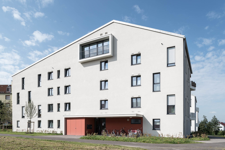 Die insgesamt sechs Häuser wurden allesamt in skulpturaler Kubatur errichtet. Über einen fünfeckigen Grundriss spannte der Planer ein asymmetrisches Satteldach ohne Dachvorsprung. Da sich die Gebäude zur gemeinsamen Grünfläche hin verjüngen, entsteht ein Raumbezug zwischen den einzelnen Baukörpern, der sowohl Weite und Ausblick generiert als auch einen gemeinsamen Kontext schafft. Um die Fassadenflächen aufzulockern wurden die gerundeten Brüstungen der den Loggien vorgelagerten Balkone von schmiedeeisernen Konstruktionen im Stil der Gründerzeit geschmückt. Diese, wie auch die Fenster, wurden geschossweise versetzt angeordnet. Sie brechen dadurch die beherrschte Formensprache der Baukörper.