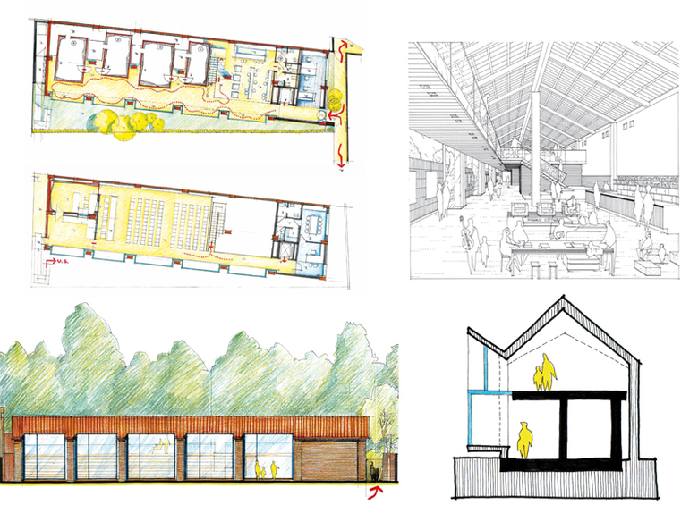 The project consists in creating two floors in the existing building. The extant brick structure will be preserved and reused to support the roof, while a new independent reinforced concrete volume will outline a new area inside the building, and guarantee soundproofing. The latter structure is composed of four volumes for the rehearsal rooms on the first floor, the only enclosed and independent areas in the two-storey volume. The saddle roof of wooden beams is rebuilt with a greater pitch and higher than the previous one. The first floor, partially opening onto the double-height ceiling, is occupied by a multipurpose hall seating 100 people.