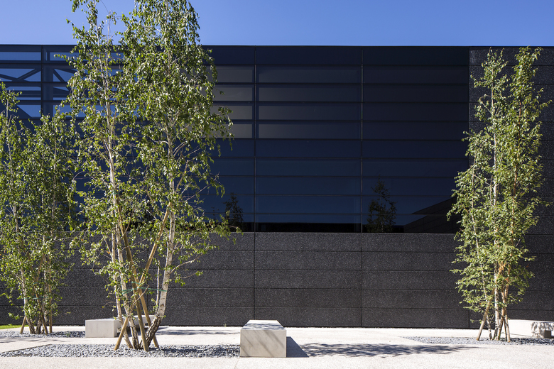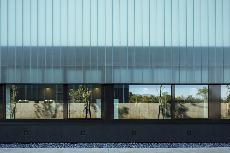 Special care was also given to the indoor/outdoor relation, by developing a landscape plan directed eastward to the plant and westward to farmland. To the south, the project connects with an area currently occupied by the entrance lodge and warehouses, which has been entirely redesigned and reorganized.
