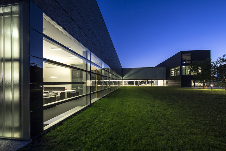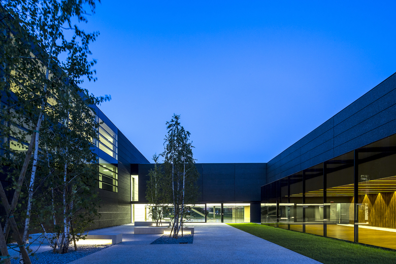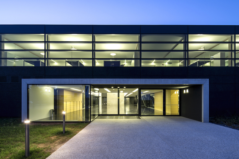 The new Headquarters are composed of two east-to-west longitudinal volumes of different heights and lengths, linked together by a central building serving as hall/reception, waiting area and functional connection between several areas.