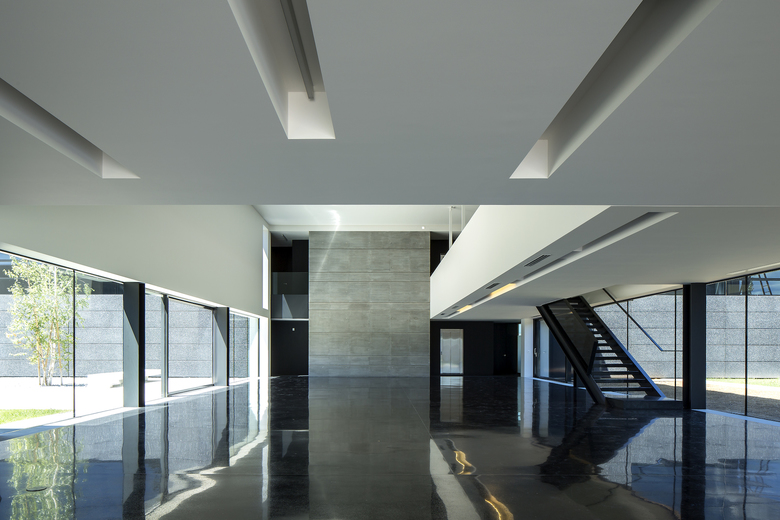 The southern building includes communal and representation areas, and namely some meeting rooms, an auditorium and a technological centre on the ground floor; administration, marketing and technical offices on the first floor.