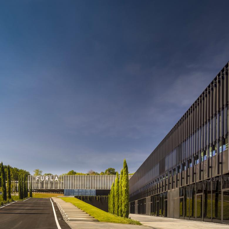 The Furla factory covers 42.000 sqm of soil - 18.300 sqm built - and has three main volumes (one for offices, two for labs and logistics) which are designed to be harmoniously integrated into the surrounding landscape, without too much contrast. Architecture and nature coexist in a functional balance.