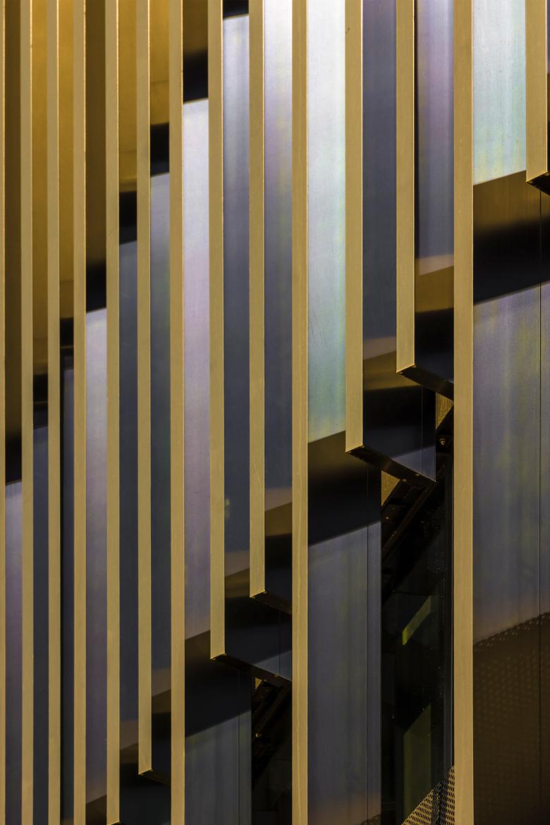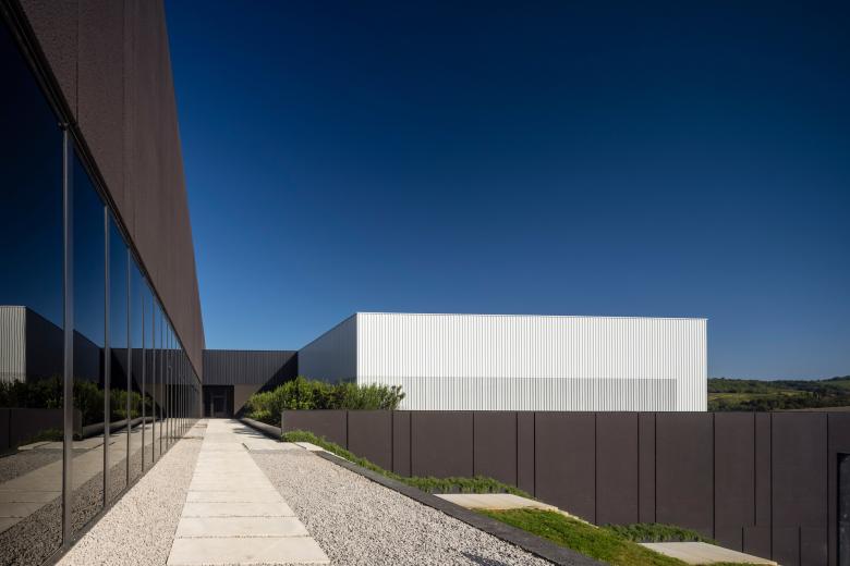 The main entrance recalls the archetype of the Tuscan villa access: a linear row of cypresses to welcome the visitor and show the way through. This rhythm is replicated on the facade of the buildings with sunscreen filtering blades that control the amount of light that can get through the work spaces in relation to the orientation and the seasons.