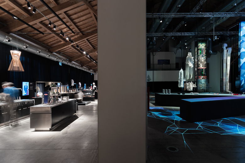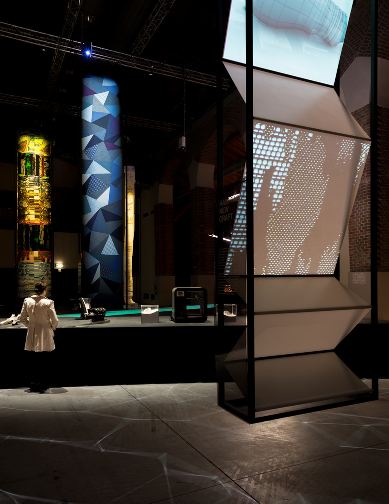 The visitor path among these nine “stems” reveals a great worktable in the iconic form of an X at its center: a place of encounter and creation, in addition to being it a support for video projections and graphic information. It is the place dedicated to workshops and to all the creative moments that put in contact the visitor with the productive process of the New Craft.