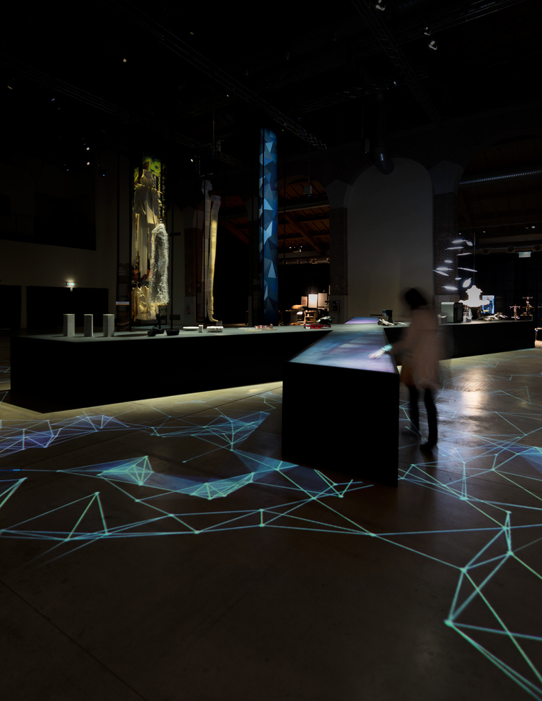 These nine installations are constituted by a virtual showcase, a metallic black frame in which the artisanal creations are displayed and emphasized by a theatrical lighting. All these elements are placed in a total-dark space aiming to recreate an evocative theatrical atmosphere.