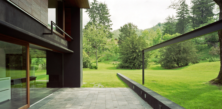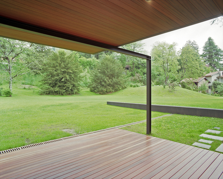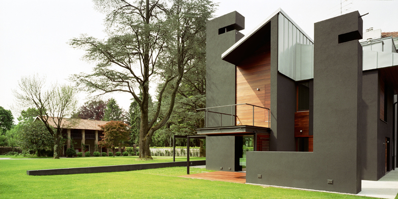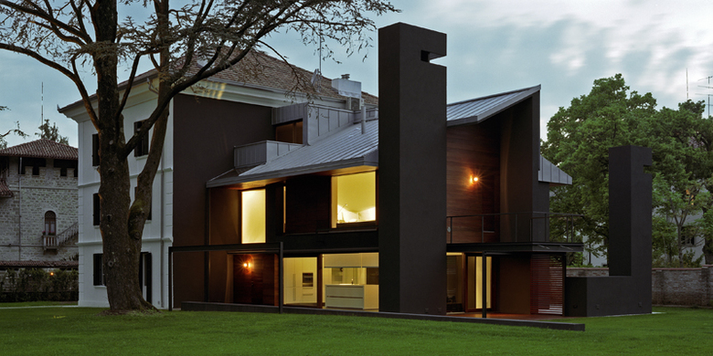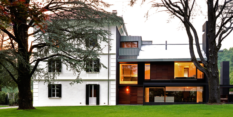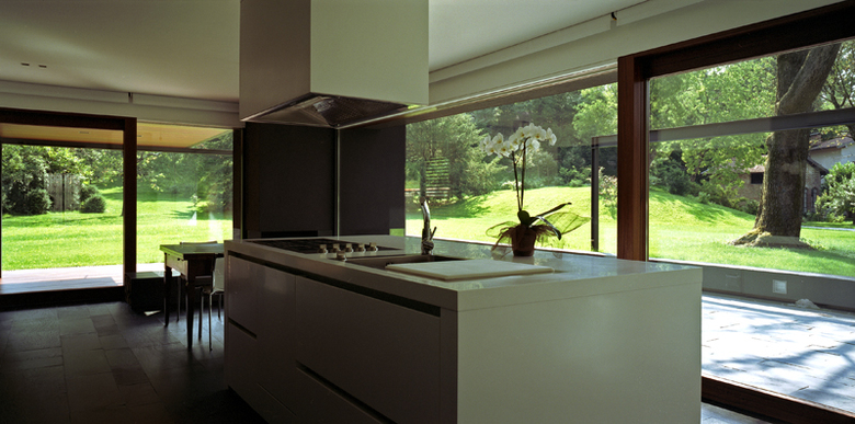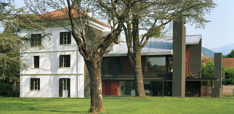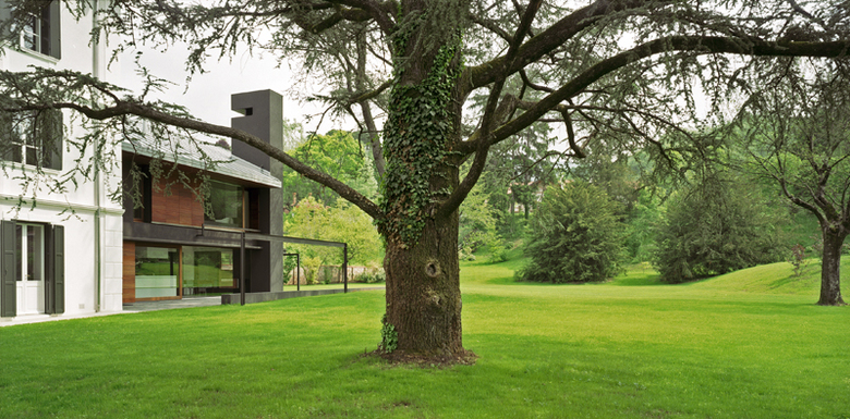 The project deals with restoring and enlarging a house from the early 20th century, planning open spaces and the park with the addition of a new garage into the hill. The enlargement of the main residence radically altered the character of the whole area. The choice of colours, receding fronts and large glazed surfaces contributed to emphasize the different character of the two volumes. One big layout links all open spaces to the buildings. The park was entirely redesigned to accentuate the woodland growing on the sloping ground and to characterize the large field underneath, so that the changing pitch of the terrain would totally conceal the new garage. This way, the complexity and quality of the whole area is preserved.