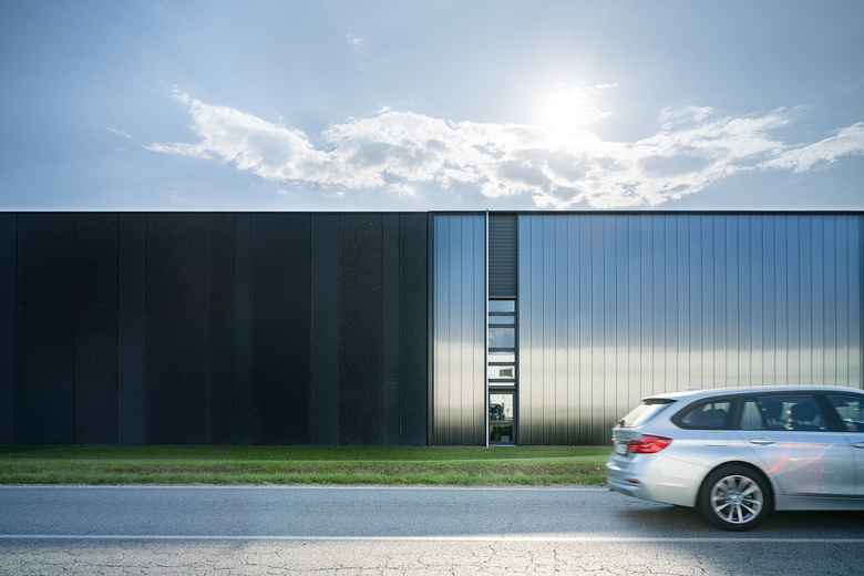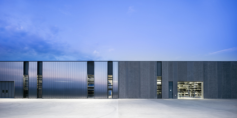 The facade consists of a single material, in a unique size: a 4 centimeters thick polycarbonate panel, about 10 meters high, fixed to prefabricated concrete panels. The polycarbonate panels are customized for this project, in order to obtain a reflecting facade when seen from afar and "deep" when observed closely. The panels consist of two different types of polycarbonate combined together: the rear side has an opaque compound which impedes the light to pass through, while the front is frozen. In this way the load-bearing structure is completely hidden behind the cladding system and the verticality of the new facade sets up an interesting dialogue with the black concrete panels of the existent building. From afar the building reflects the sky and appears cladded by huge glass plates, while close up it looks "lighter", maintaining a dialogue with the pre-existence. The mirroring of the panels also ensures a continuous color variation of the facades: depending on the time of the day and varying in light intensity the building may appear black, golden, metallic, opaque, glossy. Infinitely changeable.