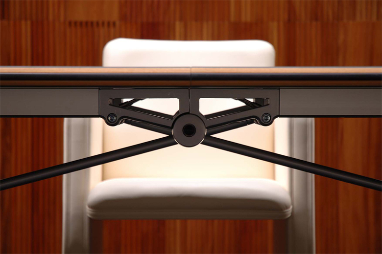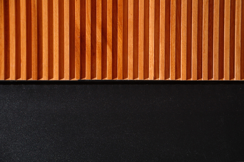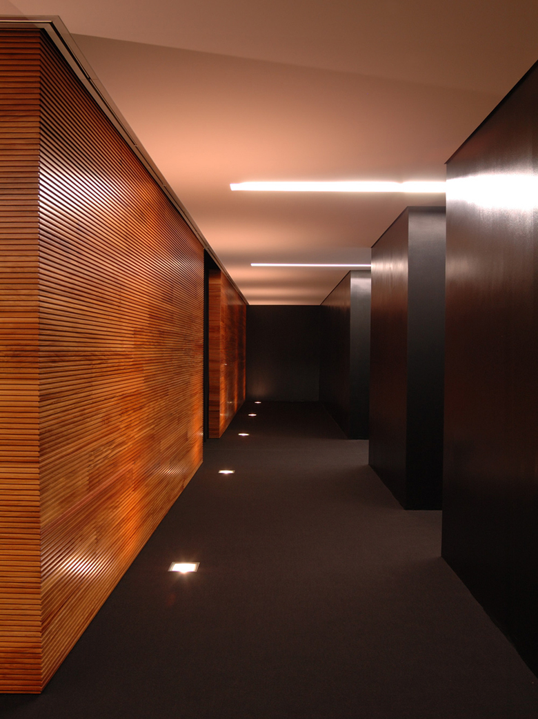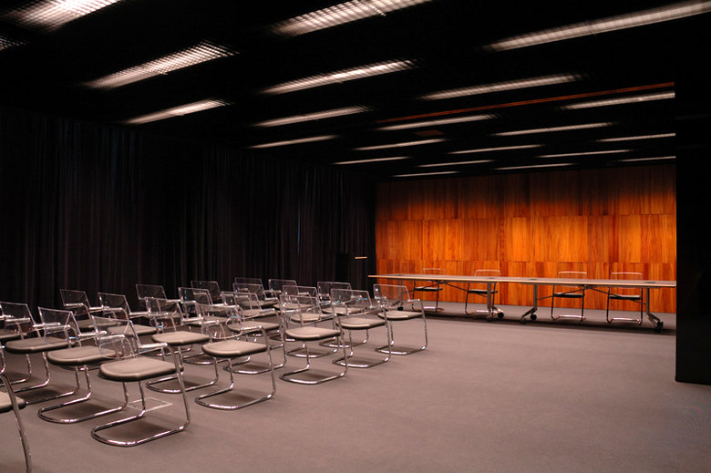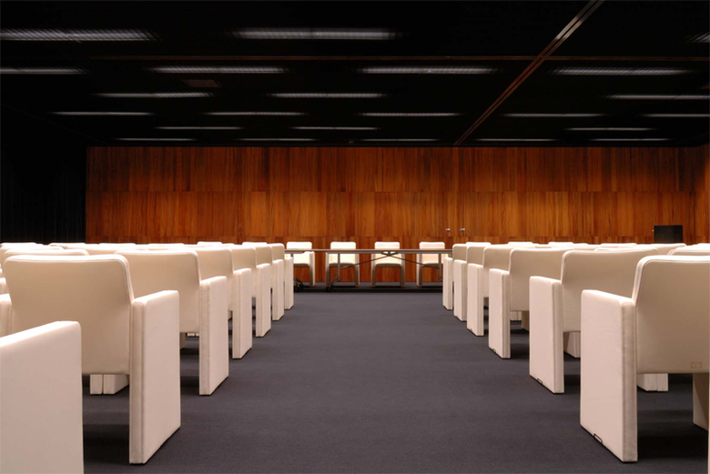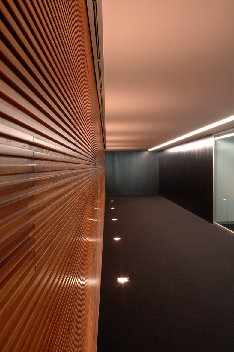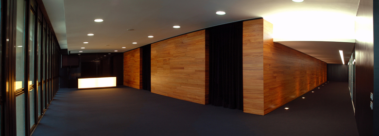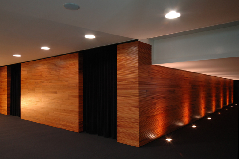 The wooden volume is entirely covered with cut-to-measure milled doussié panels, which are laid horizontally outside and vertically inside the conference hall. The panels serve as cabinets, spaces for the mobile walls, terminals of installations, soundproof sheets.