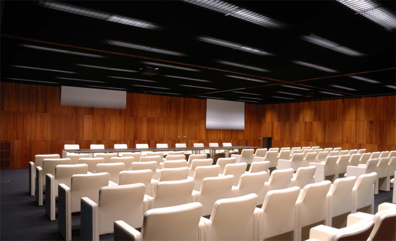 The new conference hall of SEC Servizi originates from the addition of an all-wood volume – a “musical instrument” – inside an area featuring black walls and floors, which represents the physical and acoustic separation between the main hall and the adjacent areas in the building.