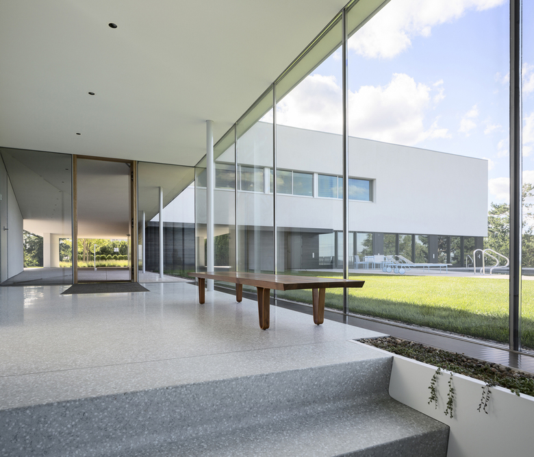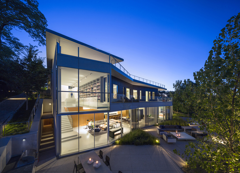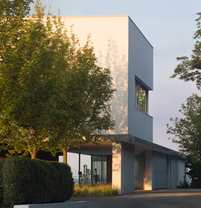 Located in the northern suburbs of Chicago, this house sits opposite a unique object: a monumental temple, 135 ft. high of white stone, symmetrically spherical, and monumental. The street-side face of the house must negotiate not only the scale and specificity of this alien architecture but also, the eclectic nature of the suburban environment. And the house must negotiate a 40 foot elevation differential between the road and the lake.