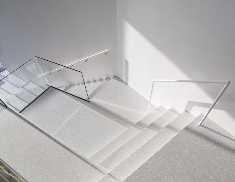 The house consists of four levels. A two story structure, windowless on the street, contains the garage, a gym, and a guest suite. This façade is unresidential in scale, but acts as foil to the monument it faces. Almost an inversion of the opposite grand stairs that lead up to the temple entrance, the main house entry is located at the top of the stair with the spaces of the house revealing themselves on the way down to the beach below. As one descends down the processional – light filled stairway the house gives itself away, beneath the typical American suburban lawn above. The architecture creates an experience, where the whole is pieced together through one’s mental landscape of moving down and through the house.