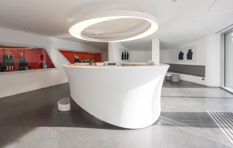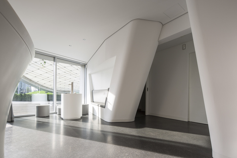 The associated service pavilion fulfills various functions: the customer can ask questions about his new car, purchase accessories or get information about Autostadt attractions and activities. As the roof follows the concept of a leaf, the pavilion is integrated into the architectural landscape and not designed as a separate building. Basic forms of the roof can be found in the interior architecture.