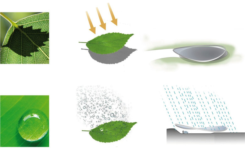 GRAFT developed the idea of a horizontal leaf that protects the landscape underneath with its organic form. “WES-Landschaftsarchitektur” planned the landscape surrounding the roof. In the architectural application of this image, it was necessary to produce the greatest possible lightness: A special static principle allows for the unique roof structure to be
