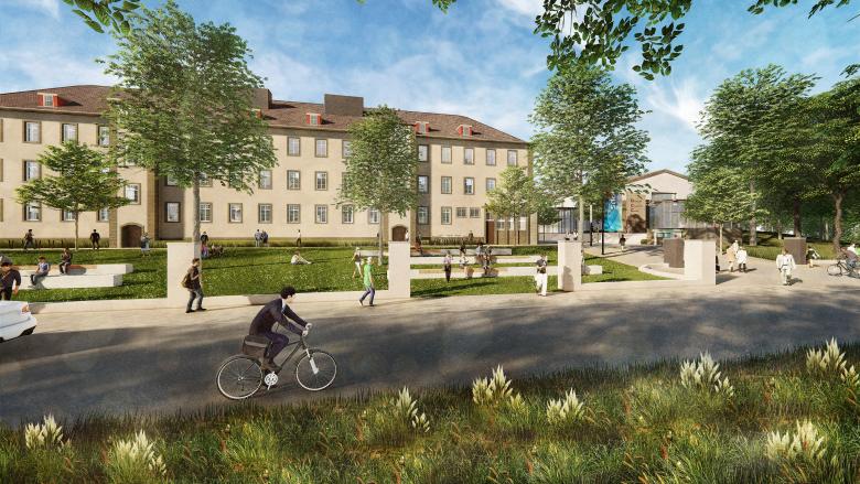 denkmalgeschützten Kasernengebäuden ist dabei zu erhalten und bei der Gestaltung der Freianlagen aufzugreifen. Unser freiräumliches Konzept verfolgt die Idee, dem Campus eine klare innere Grundstruktur zu verleihen, sodass ein harmonisches Ensemble aus Kasernengebäuden und Grünflächen geschaffen wird und gleichzeitig die Vernetzung zu den umliegenden Stadt- und Grünräumen hergestellt wird. Damit im Inneren des Campus eine hohe Aufenthaltsqualität erzielt werden kann, wird der Autoverkehr weitgehend aus dem Kernbereich herausgehalten.