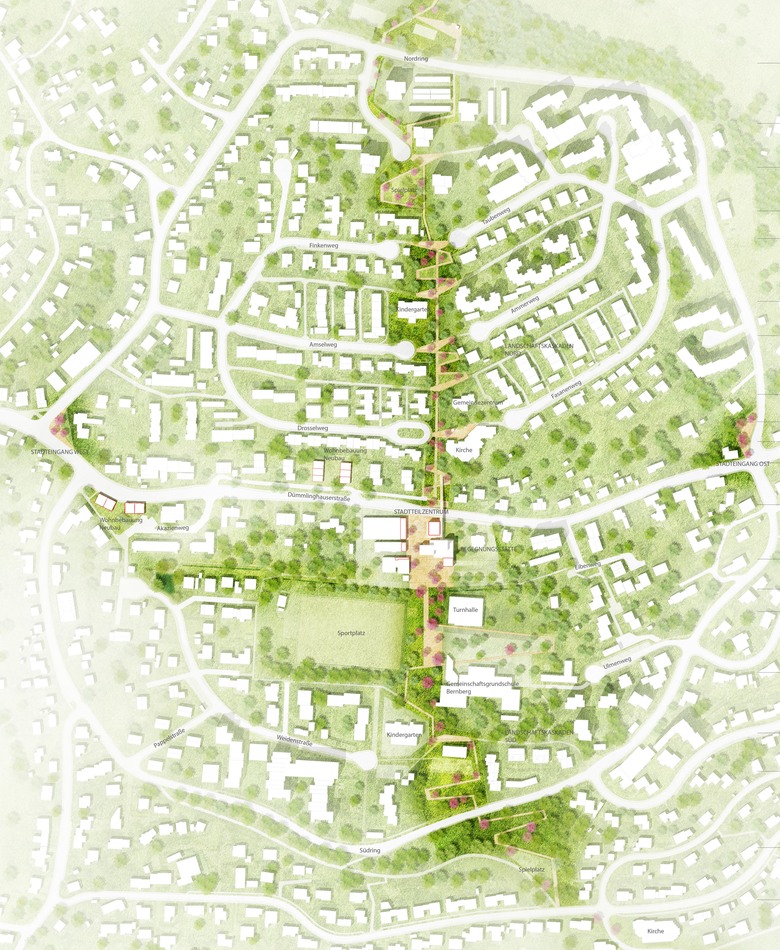 Daher ist das Ziel unseres Konzepts, den Planungsraum durch eine zielgruppenorientierte Planung zukunftsfähig zu gestalten. Bernberg bietet eine attraktive, ländliche Umgebung, zahlreiche Infrastrukturangebote sowie eine gute Anbindung an nahegelegene Mittel- und Oberzentren. Diese positiven Aspekte werden nun in Folge des Konzepts durch eine ansprechende und dem Ort angemessene Gestaltung des Stadtteils ergänzt. Das barrierearm umgestaltete Stadtteilzentrum mit neuem Marktplatz und sanierter Begegnungsstätte bildet dabei den urbanen Mittelpunkt innerhalb der „Grünen Fuge“. Die „Landschaftskaskade“ soll das Miteinander und den Austausch des von vielen Kulturen geprägten Gummersbacher Stadtteils fördern.
