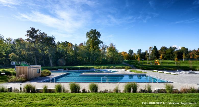Durch den Eingang gelangen die Besucher:innen in das Gebäude mit Hallenbad, welches das urbane, belebte Zentrum des Areals bildet. Dieses wird durch eine klare und lineare Gestaltung charakterisiert. Das Freiraumkonzept sieht eine allmähliche Transformation dieser Urbanität in eine ruhige, natürlich anmutende Landschaft mit einer geschwungenen Formsprache vor. Ein weiteres prägendes Gestaltungsmerkmal ergibt sich aus der Topographie des Geländes. Die unterschiedlichen Höhen des Freiraums werden in Form von Ebenen sichtbar gemacht und durch Böschungen akzentuiert. Die Ebenen dienen gleichzeitig als Grundlage für die Aufteilung der verschiedenen Nutzungen, wie die Außenterrassen, die Schwimmbecken, der Aktivbereich, das Kinderschwimmbecken, der Wasserspielplatz und der Sandspielplatz.