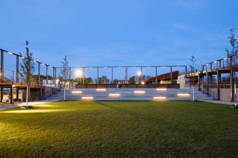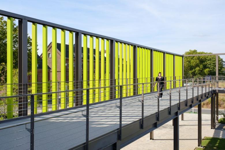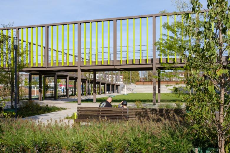 Der 2022 realisierte Brückenpark bildet hierbei ein Kernelement des Grünzuges und als „Grünes Tor“ den Übergang zur Ostseite. Aus der Notwendigkeit der barrierefreien Abwicklung der Campusbrücke über eine Höhendifferenz von rund sechs Metern entwickelten wir die Idee einer spannungsvollen vertikal-raumbildenden „Grünen Arena“, wodurch der Weg über die Brücke zum besonders attraktiven Erlebnis wird. Im Sinne einer „living bridge“ ist hier ein belebter und vielfältig nutzbarer Freiraum für alle Generationen entstanden. Im Zentrum steht die multifunktionale Quartierswiese, die von einer sonnenexponierten Rasentribüne begleitet wird. Die einfache und robuste Stahlfachwerkskonstruktion erinnert an die industrielle Bahnnutzung und an die Architektur der Werkshallen. Durch die Begrünung der Flanken mit Kletterpflanzen entsteht ein freundlicher, atmosphärischer und transluzenter Innenraum. Die nahezu vier Meter hohen Bereiche unter den Stegbrücken werden als überdachte Fahrradstellplätze genutzt.