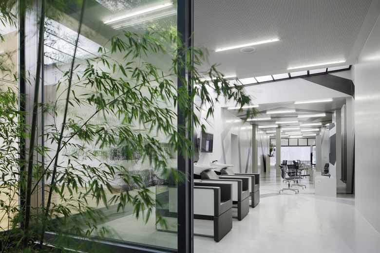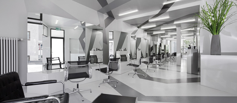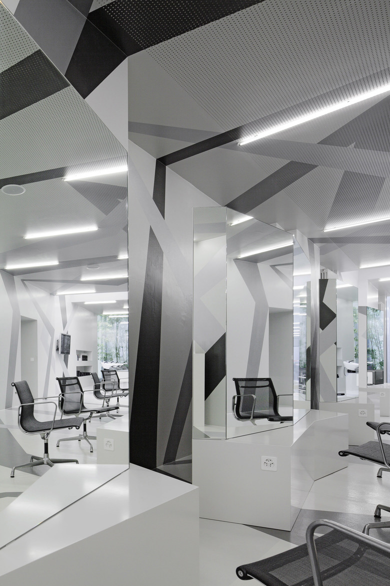 Neu wurde an der hinteren Parzellengrenze ein kleiner Innenhof eingestanzt. Zwischen diesem neuen ruhigen Grünraum und der strassenseitig präsenten Urbanität spannt sich der Hauptraum des Salons linear auf und erhält neu zwei unterschiedliche atmosphärische Pole. Die bestehende Rohbaugeometrie des Innenraums ist geprägt durch eine Vielzahl von Absätzen, Rücksprüngen, welche aus statischen wie auch finanziellen Gründen nicht veränderbar waren. Das visuelle Konzept der „Dazzle- Painting“ für die Oberflächen von Wand Boden und Decke, welche zusammen mit Tatin Designstudio Basel entwickelt wurde, überwindet die Unreinheit des Raumes und osziliert zwischen perspektifischer Überhöhung der Raumtiefe und Zerstörung des Räumlichen in ein zweidimensionales Tableau. Die spiegelnden verformten Bedienmöbel bilden eine weitere Raum- und Reflektionsebene welche die Fassung der Raumwahrnehmung je nach Betrachterstandpunkt zusätzlich dynamisiert. Das Konzept des Umbauprojekts wurde mit minimalem finaziellen Budget erstellt.