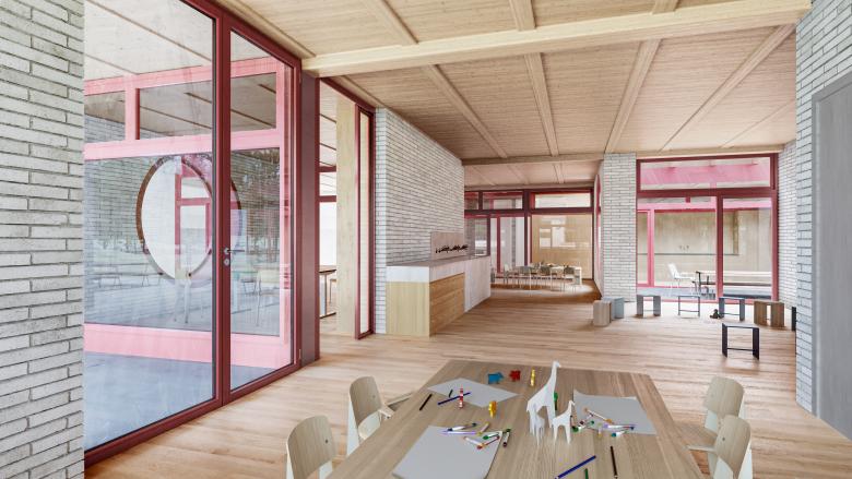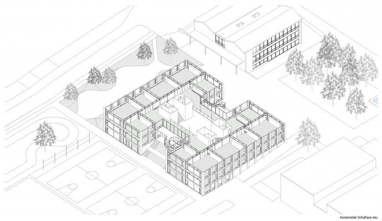 Die beiden Neubauten für Schule und Kindergarten ermöglichen die bestehenden Gebäude zu einer gemeinsamen räumlichen Fassung als „Öffentliche Anlage„ mit einer erkennbaren Mitte zu führen. Die autonome Adressbildung des Kindergartens zum Gassacker und der wilde Garten nach Osten führt zu einer „Intimität für die Kindergartenkinder“ und reagiert auf die räumliche Nähe zum Pausenbereich der Oberstufe. Auf der Basis des städtebaulichen Konzeptes entwickeln sich die beiden Gebäude durch die jeweiligen altersspezifischen pädagogischen Anforderungen. Steht bei der Schule das Kollektiv und das Partizipieren in der Gemeinschaft; die temporäre Aneignung von Räumen und eine räumliche Veränderbarkeit im Fokus, bildet beim Kindergarten der geerdete Bodenbezug stabile Raumgefässe mit grösserer Intimität und das Teilhaben an einzelnen, gemeinschaftlichen Räumen die Ausgangslage zur Entwicklung der architektonischen Form. Für den Kindergarten ist die Bildung von auffindbaren Adressen (ein Zuhause) und die Gliederung in intime überschaubare Räume sind auf Grund der Anzahl der Kindergarteneinheiten und der Integration in einem grossen Schulareal für das Wohlbefinden der Kindergartenkinder für die Innen und Aussenräume zentral. Im Gegensatz zum Schulgebäude werden die Kindergärten altersentsprechend als stabile „statische“ Räume entwickelt. Das gegliederte eingeschossige Kindergartengebäude schmiegt sich dem natürlichen Gelände folgend im Westen des Schulareals ein. Entlang dem Hausmattweg entstehen durch die Staffelung des linearen Baukörpers in Höhe und Tiefe drei Eingangsbereiche als Adressen (Reihen-Doppelhaus) für je zwei Kindergärten. Die Erschliessungsachse führt vom Vorbereich mit der gedeckten Eingangszone in die Garderobe und direkt zum umfriedeten wilden Garten. Die drei entstehenden Doppelkindergärten erhalten zur Verknüpfung untereinander eine lineare, dem natürlichen Gelände folgende innere Erschliessung als Rückgrat des Hauses. Das Herz des neuen Schulhauses bildet der zweigeschossige Versammlungsaal mit den angrenzenden Galerien und Treppen. Es entsteht eine polyvalente Raumbühne oder Werkhalle für die Schulgemeinschaft, mit möglicher Vernetzung zu den angrenzenden Aussenräumen im Norden und Süden. Die typologische Grundstruktur des Schulgebäudes zielt auf eine hohe Wandelbarkeit bei sich veränderten räumlichen Bedürfnissen und ermöglicht altersgerechte Unterrichtsformen vom klassischen Frontalunterricht in der Kerngruppe, über individuelles Lernen mit der Integration des spezifischen Förderunterrichtes bis zum klassenübergreifenden und altersdurchmischten Arbeiten in der offenen Lernlandschaft. Diese Grundstruktur ermöglicht ohne wesentliche bauliche Veränderungen im Sinne des „Raumes als Dritter Pädagoge“ die Bespielung mit unterschiedlichsten Lernformen: Konzepte mit festen Klassen und Gruppenräumen mit ergänzenden, offenen Lernlandschaften (z.b. für das Churer Modell) bis zur stark individualisierten Lernkonzeption (skandinavischer Open-Space). Die Typologie des neuen Schulhauses und des Kindergartens ermöglichen das Brandschutzkonzept mit uneingeschränkter Benutzung der gesamten Geschosse inklusive der Treppenbereiche als möblierbare Unterrichtsräume. Im Kindergarten werden auf Grund der pädagogisch wünschenswerten stabilen Räumen und der nicht notwendigen Veränderbarkeit zusätzliche raumbildende Elementwände und Raumkörper eingesetzt. Im Gegensatz dazu erfolgt die Gebäudeaussteifung im Schulhaus mit lediglich vier Kernen im Bereich des Treppenhauses, welches eine maximale Grundrissflexibilität und Veränderbarkeit der Schulgeschosse ermöglicht.