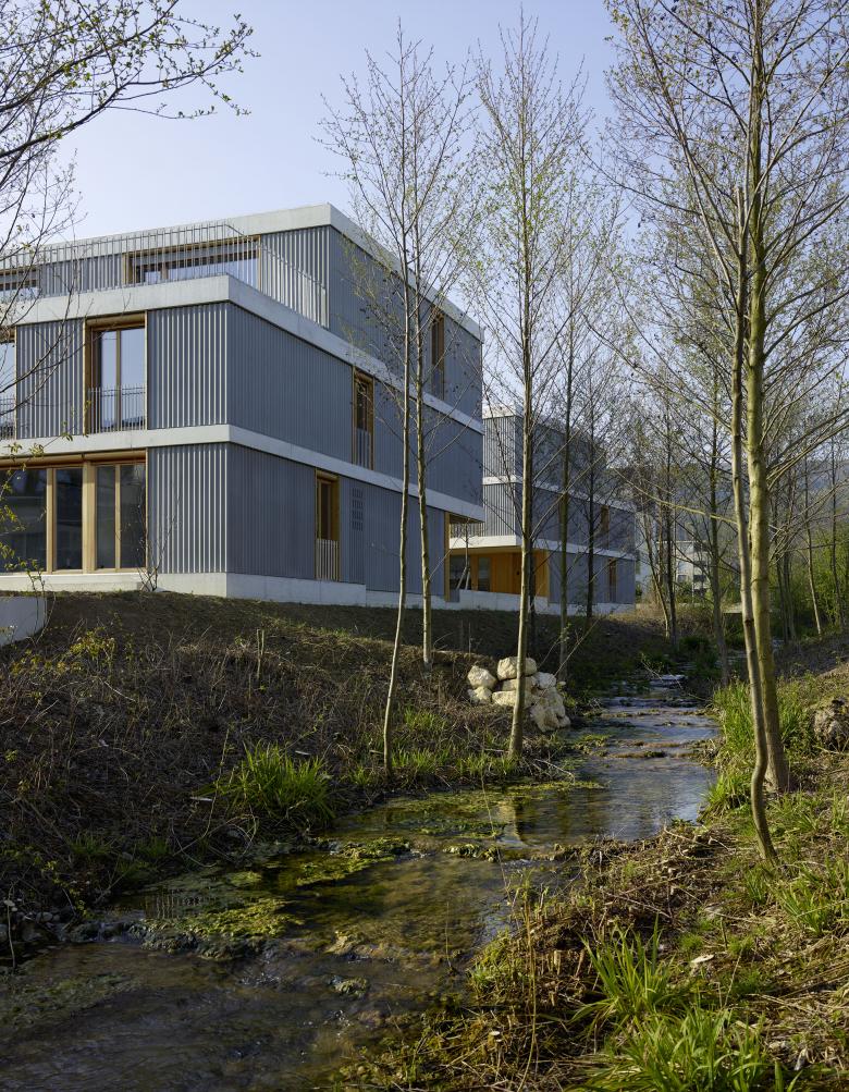 Zwei längliche Baukörper formulieren einen Hofraum, welcher das Zentrum der Siedlung bildet. Der Platz orientiert sich zum westlich angrenzenden Bachraum. Der neu angelegte Naturraum des Baches trägt in sich das Potential eines grünen Rückgrats des Quartiers. Das Projekt sucht das starke landschaftliche Verweben des Baufeldes mit dem angrenzenden Dorfbach, welcher als Aufenthalts- und Spielort genutzt werden kann. Entlang der beidseitig gedeckten erdgeschossigen Lauben werden die Eingänge der 16 Wohnungen als eigenständige Adressen zusammengeführt. Die Laube dient als Erschliessungsraum, als gedeckter Aussenraum für die Wohnungen und bildet einen Schwellenbereich zwischen der Gemeinschaft und der Privatheit. Die reihenhausähnliche Typologie der Wohnungen ist für ein kollektives Familienwohnen prädestiniert.