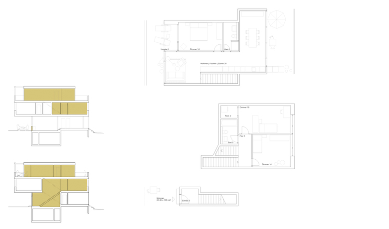 Die Mietwohnungen werden durch die eigene Adresse, ihrer mehrgeschossigen Typologie mit eigenem Gartenanstoss oder begrünbarem Attikaanteil zum „Mieteinfamilienhaus“. Die kompakte Organisation der Grundrisstypen ermöglicht das Einhalten der gewünschten Wohnungsgrössen. Die erdgeschossigen Aussenräume der „dem Platz“ abgewandten Seite bilden den Wohnungen zugeordnete private Gartenräume. Entlang dem Siedlungseingang wird der Gemeinschaftraum angeordnet. Der Gebäudehülle in Holzmodulbauweise wird ein Rankengeflecht vorgelagert. Dieses Gitter prägt die Erscheinung des Gebäudes und fasst die zum Platzbereich liegenden Aussenräume des Attikageschosses räumlich ein. Es bildet ein mögliches Rankengerüst für Kletterpflanzen. Die Gebäudehülle wird somit örtlich Teil des umgebenden Gartenraumes und ermöglicht den oberen Wohneinheiten eine Begrünung des Dachgartens.