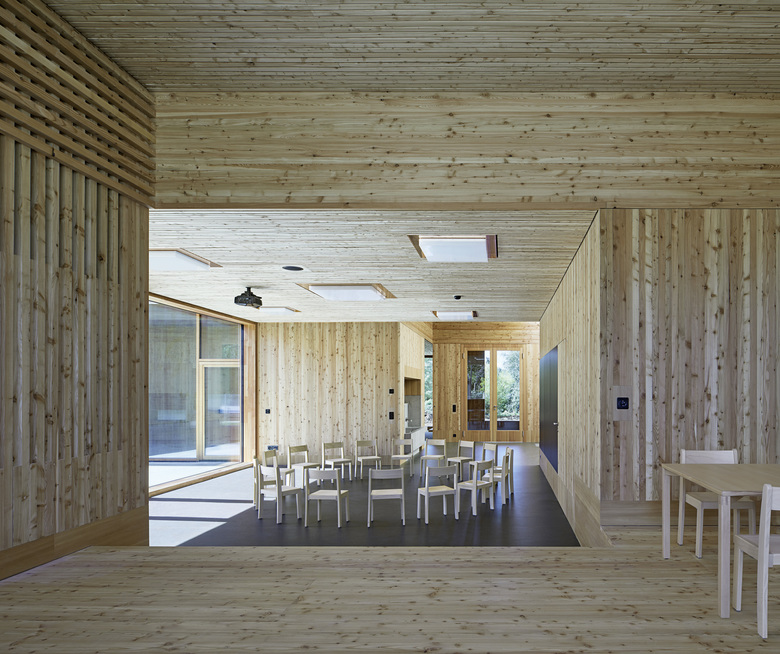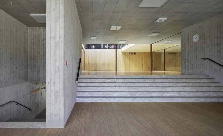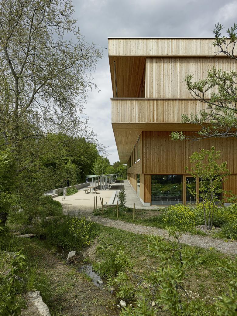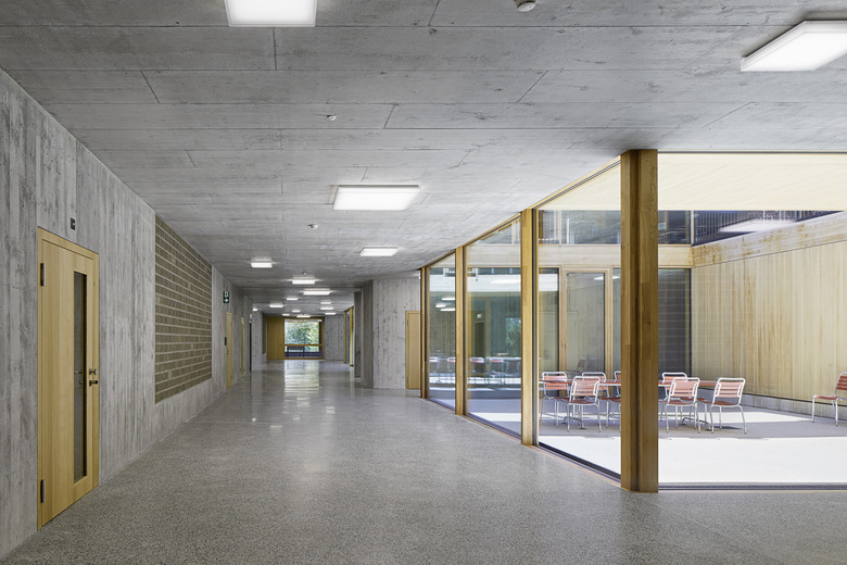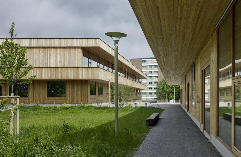 Im Kindergarten werden architektonische Themen des Schulhauses altersgerecht weitergeführt wie z. B. der Hof, die Raumstaffelung, die differenzierten Raumhöhen, und die mehrseitige Belichtung. Die Aula stellt ein polyvalentes Raumgefäss dar mit eigener Adresse für die Schule und die Öffentlichkeit. Die gewählte Organisation ermöglicht eine wandelbare Bespielung und räumliche Anpassung je nach Anlass. Mit der Mischbauweise (Zwischendecken, Innenwände massiv, Dächer und Aussenwände in Holz, Fassade in Skelettbauweise aus Beton) wird eine nachhaltige, recyclingfähige, grauenergiearme oekonomische Konstruktion gewählt. Das Material sowie die Formal zurückhaltende äussere Erscheinung welche durch architypisch-traditionelle Bauelemente, wie zum Beispiel die Holzfassade mit schützenden Vordächer, geprägt wird, lädt die Kinder zur aktiven Inbesitznahme und dem Begreifen des Gebäudes ein. Wo möglich werden Baumaterialien, die Technik sowie die räumlich strukturelle Ordnung unverkleidet sichtbar gehalten.