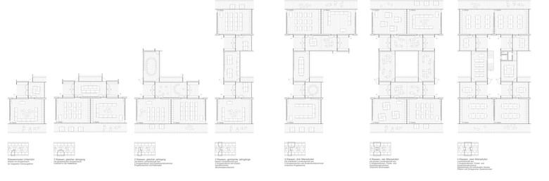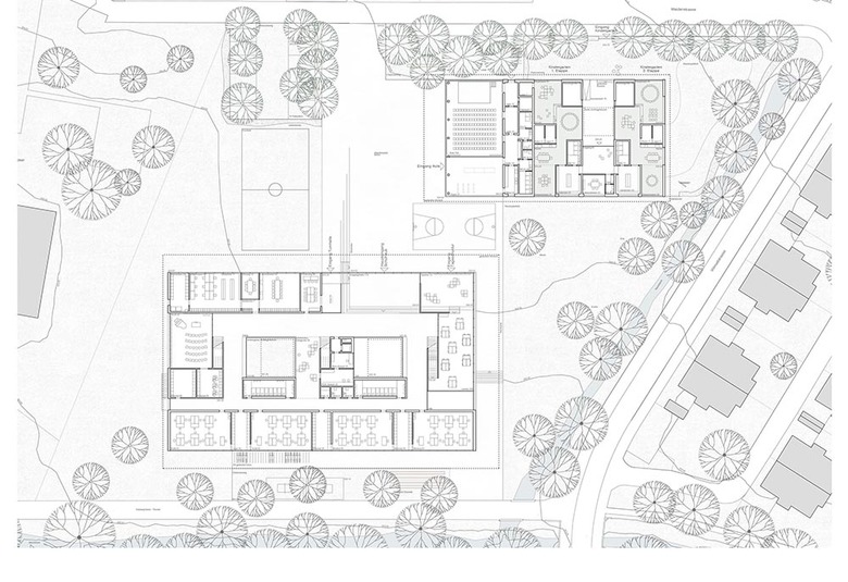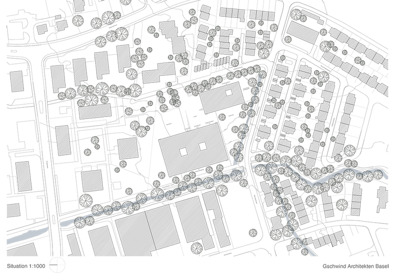 Das Schulareal befindet sich an der Nahtstelle dreier unterschiedlicher städtebaulicher Muster – westlich zu grossflächigen Gewerbehallen des angrenzenden Industriegebietes, nördlich zu punktförmigen Mehrfamiliengebäuden im Grünen und zu kleinen Einfamilienhäusern im Osten und Süden. Die zweiseitig begleitenden Bäche, die Blickbezüge zur bewaldeten Hügelkette im Osten und der Fernblick zum Blauen prägen die Atmosphäre des Ortes stark mit. Die städtebauliche Gradation, die raumprägende Fliessrichtung des Marchbaches mit seinem dichten Baumbestand, und die Geometrie des Areals formt die Baukörper und definiert die Aussenräume. Einem Geschwisterpaar ähnlich, bilden das Schulhaus mit integrierter Tagestruktur und Turnhalle sowie das eingeschossige Aula- und Kindergartenhaus zwei verwandte Gebäude. Die flachen Baukörper mit Bodenkontakt spannen unterschiedliche Aussenräume im Areal im Bezug zur Landschaft und Bebaung auf. Das Stapeln von Turnhalle und Schulnutzung bildet die Basis für eine in die Fläche entwickelte Lernlandschaft im 1. Obergeschoss welche über drei einläufige „Familientreppen“ mit jeweils vier Klassen via Eingangshalle vom Pausenplatz erreichbar ist. Zur Orientierung, zur Belichtung und zum visuellen Bezug der unterschiedlichen Nutzungen und Räume werden zwei begrünte Innenhöfe über zwei und drei Geschosse in das Volumen eingeschrieben. Die Cluster-Typologie des Schulgeschosses ermöglicht die Bildung von individuellen, kommunikativen Lernumgebungen unterschiedlichster Art und Grösse. Sämtliche Hauptklassenräume sind zweiseitig belichtet (Morgensonne) und erhalten dem Schulzimmer vorgelagert, ein „Sommergruppenraum“ in Form einer gedeckten Laube. Dies ermöglicht das temporäre Erweitern des Klassenzimmers ins „Freie“.