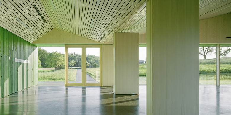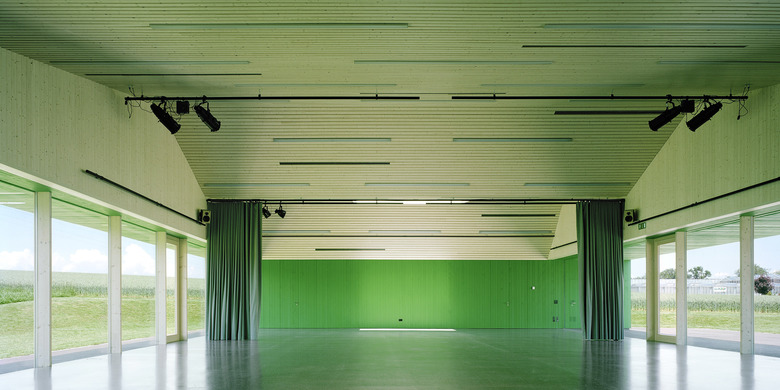 Typologisch angelehnt an die ortsprägenden Gewächshäuser übernimmt der neue Baukörper ortstypische Elemente und deutet sie zu einer eigenen formalen Sprache um. Aufgespannt zwischen den beiden Fusspunkten mit den Serviceräumen, wird der grosse Hallenraum Teil des Weges zum Friedhof. Der polyvalent nutz- und erweiterbare Raum ist mittels Trennwänden und Vorhängen unterteilbar. Je nach Raumaufteilung entstehen durch die gefaltete Decke angemessene differenzierte Raumatmosphären, die einen Rahmen für die unter schiedlichen Bespielungen bilden, von Schulaufführungen bis zu Abdankungsgottesdiensten. Das Raumkonzept des aufspannten grossen gedeckten Raumes mit fliessendem Bezug zum angrenzenden offenen Landschaftsraum findet konstruktiv in der brückenförmigen Tragstruktur aus Fachwerkträger in Holz ihre konstruktive Entsprechung. Das Konstruktionsmaterial Holz prägt auch die äussere Erscheinung des Gebäudes und nimmt Bezug auf traditionelle Oekonomiegebäude im Seeland. Die Fassaden erhalten eine sägerohe grünpigmentierte satt gestossene Tannenschalung, welche je nach Distanz des Betrachters ein Changieren zwischen abstrakter Körperlichkeit und habtischer Materialität erzeugt. Das Bekleiden mit Holz wird im Gebäudeinnern als Futteral im Saalbereich weitergeführt.