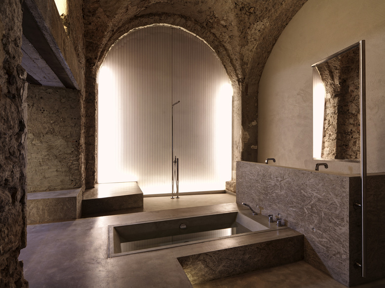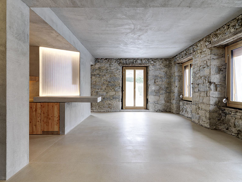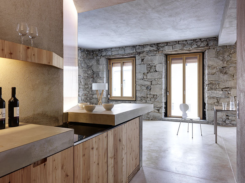 Raw Is Finished - We have natural stone walls of one meter width, concrete furniture and wooden windows with a 20 cm thick solid frame. The dialogue on the historical context consists in the reference of the 'work', how and by whom was it made - at that time large stone blocks were stacked together - today, topographies were formed from reinforced concrete.