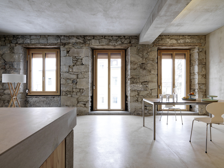 House Z22 - The dwelling house is a townhouse built 170 years ago. The natural stone walls were created so long ago, but even then the walls were plastered. Now we have removed the original plaster layers and this led to a raw state of the natural stone walls, which never existed. It is a reference to the material, the construction and to the 'work' itself, how was it made?