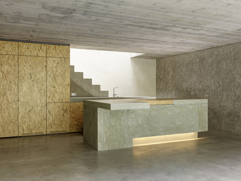 The built in light weight strucures are plastered with basic plaster - and have a rocky appearance. The built-in furniture is made of raw concrete, raw wood and raw plaster.