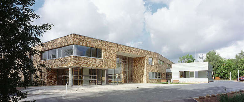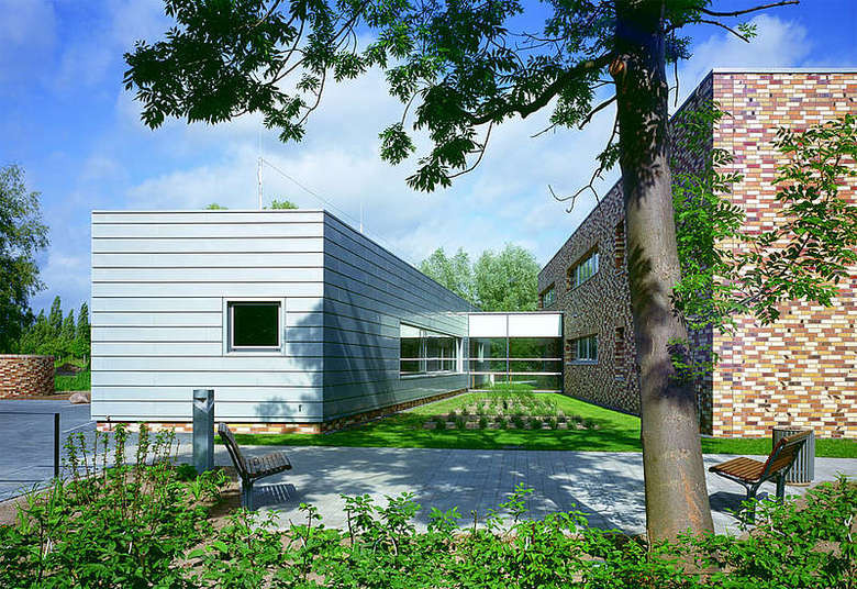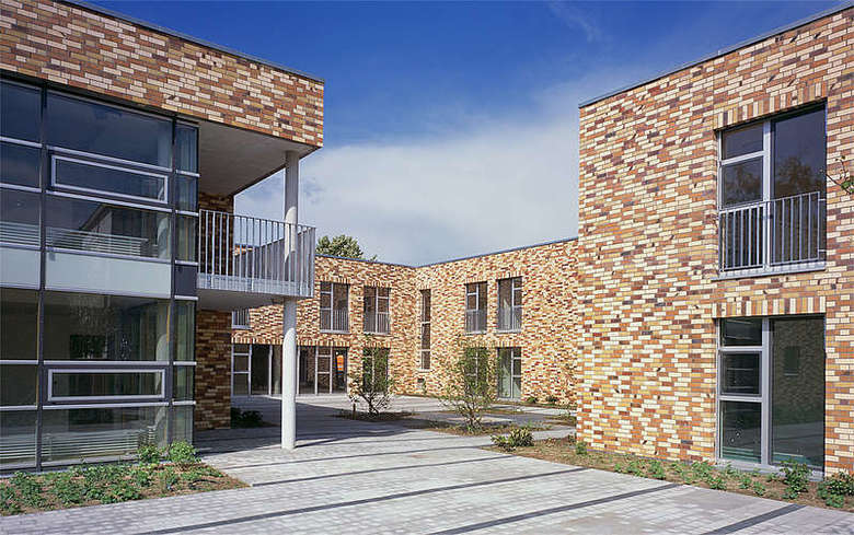 Die Anordnung der Gebäudeflügel um einen geschützten privaten Innenhof , der sich nach Südwesten öffnet, bewirkt spannungsvolle Aussen- und Innenräume. Die Klinkerfassade in warmen Farben zusammen mit der Bepflanzung, den Magnolien als Mittelpunkt des Hofgartens, sorgen für eine behagliche, private Atmosphäre.