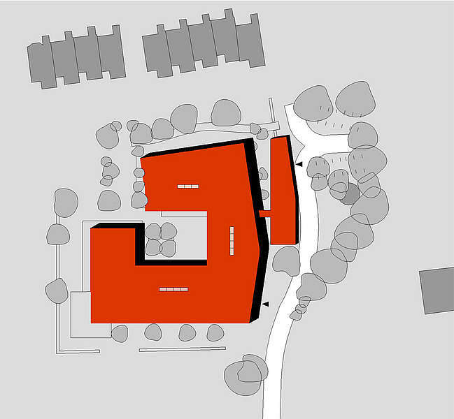 Das Seniorenpflegeheim befindet sich in zweiter Reihe auf dem Gelände des ehemaligen Landratsamtes. Durch die Zweigeschossigkeit ordnet sich das Haus dem Bestand aus der Gründerzeit deutlich unter und fügt sich selbstverständlich in die sonst heterogene Struktur ein. Bei zurückhaltendem Erscheinungsbild und reduzierter Formensprache schafft das Gebäude Ruhe in einem eher unübersichtliche Kontext.