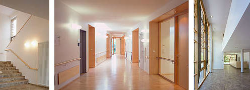 Der eingeschossig vorgelagerte Bereich der Küche ist in Zinkblech verkleidet und durch einen gläsernen Verbindungsgang an das Hauptgebäude angeschlossen. Er orientiert sich nach Norden und bildet mit dem Hauptgebäude den Vorplatz. Das Foyer ist mit Galerie und großzügiger Treppe einladend und ermöglicht bei guter Orientierung Einblicke in die einzelnen Pflegebereiche, den großen Speisesaal und den anschließenden Innenhof.