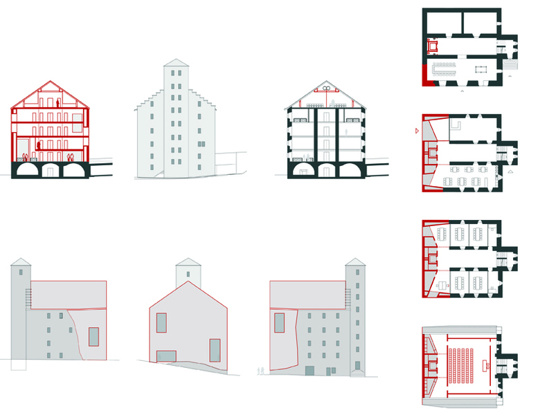 Das Konzept sieht vor, der dreischiffigen Struktur ein Passstück aufzusetzen, das sämtliche technologischen Funktionen (Lift, Steigzonen, Nasszellen, Belichtung etc.) enthält und somit die erhaltene Struktur möglichst wenig tangiert.