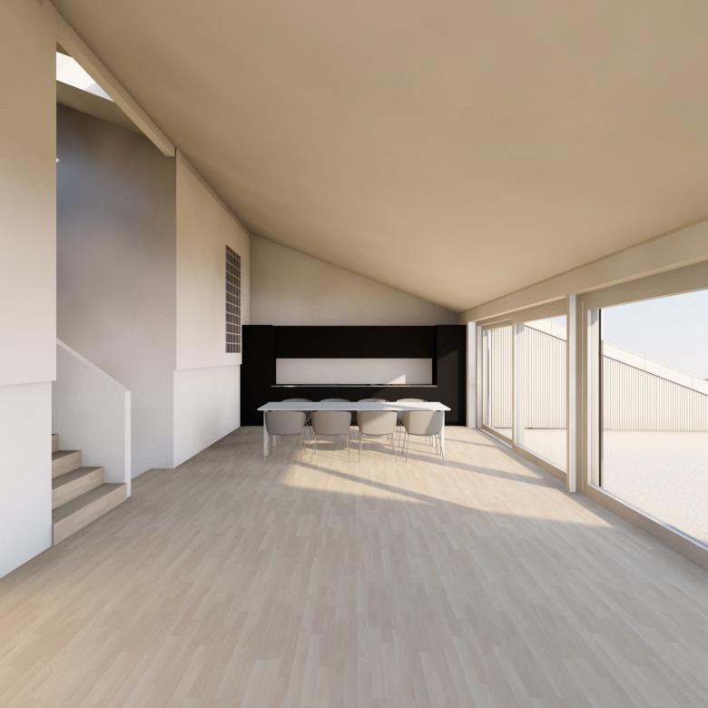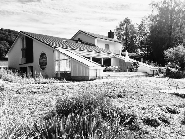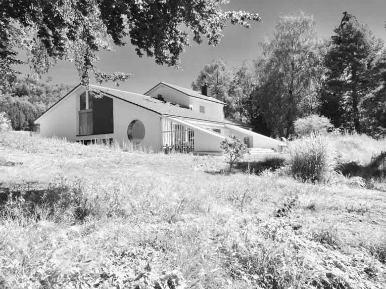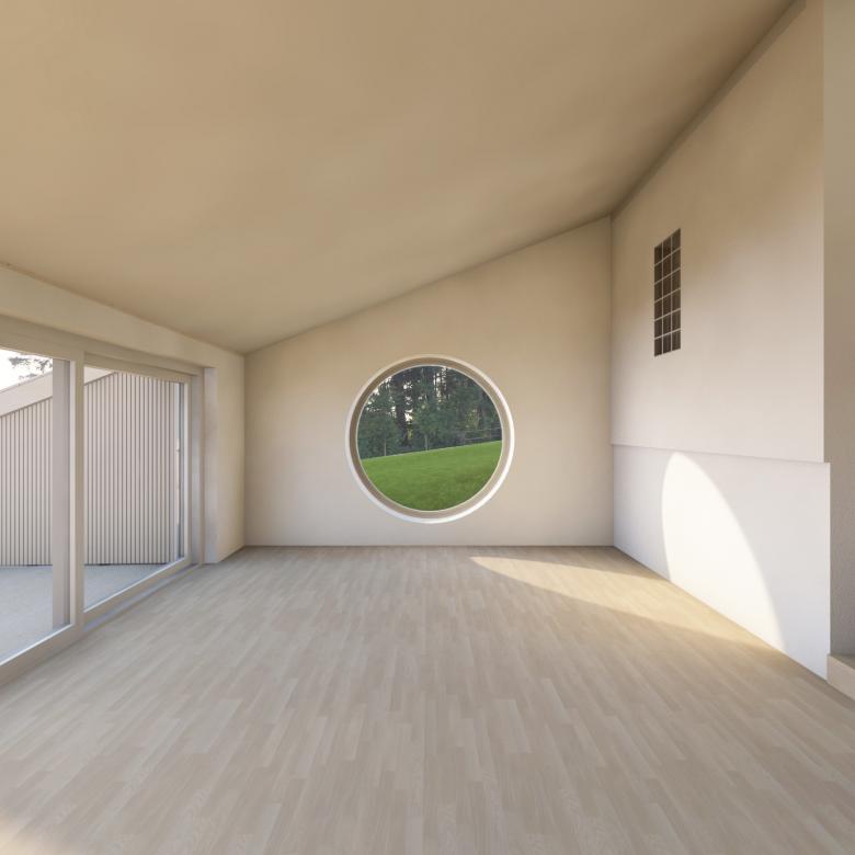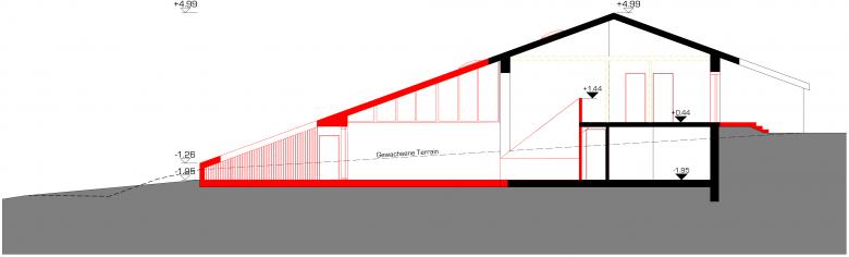 Architektonisch betrachtet definiert sich das bestehende Gebäude aus einem zweigeschossigen Mitteltrakt, welcher sich mit eingeschossigen Seitentrakten zu einer ausgewogenen dreiteiligen Einheit manifestiert. Die austarierte Gebäudevolumetrie besitzt eine Affinität zur harmonisch strukturierten Hügellandschaft. Das bestehende Gebäude ist demnach nicht als Kontrast zur Landschaft konzipiert. Die sanfte Einbettung des dreiteiligen Baukörpers sucht vielmehr die Konvergenz zur landschaftlichen Tektonik.