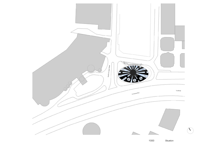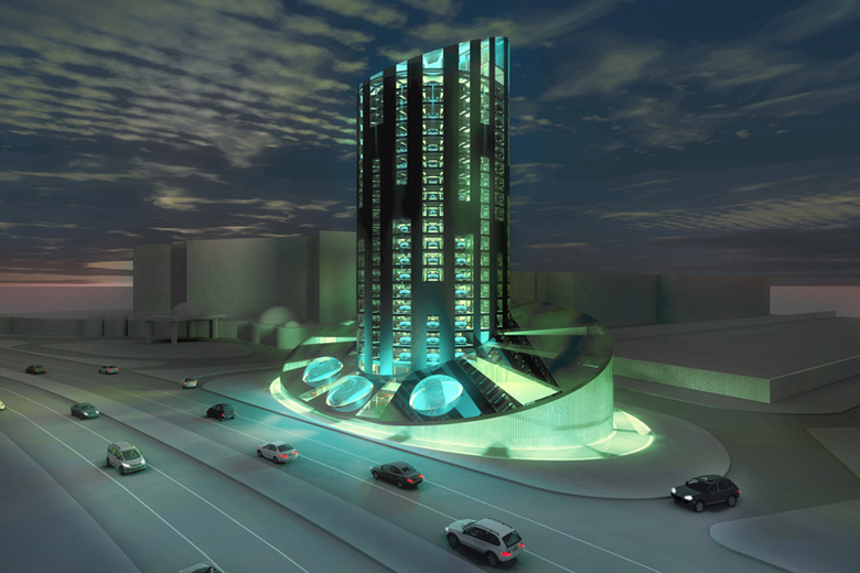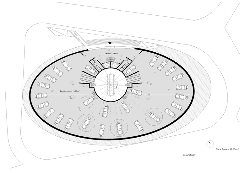 Der vorliegende Entwurf basiert auf diesen beiden Bildern. Auf einer dem Highway zugewandten und geneigten Ebene werden die Autos unter einer Glaskuppel dem vorbeifahrenden Publikum präsentiert. Damit die Präsentation nicht nur statischer Natur ist, stehen die Autos auf einer Drehscheibe, um so dem Betrachter ein dreidimensionales Bild zu vermitteln.