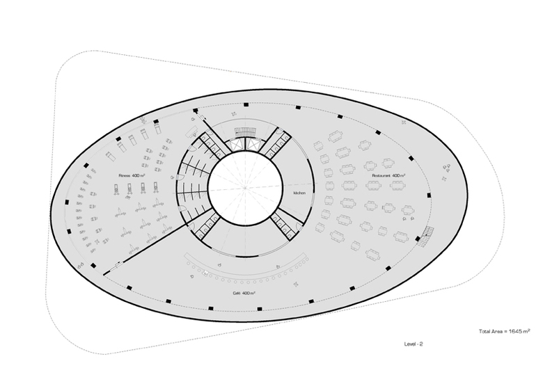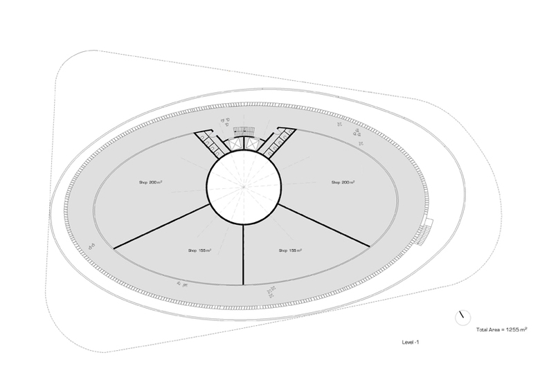 In den beiden unteren Geschossen befinden sich die Shops, das Gym und das Restaurant. In Analogie zu den engen Gassen im Suk, sind diese Geschosse über eine umlaufende Vertiefung zenital belichtet. Um das Aussenklima in dieser Vertiefung in einem für den Menschen erträglichen Mass zu halten, wird der Zwischenraum mit Lamellen überdacht, welche sowohl als Lichtfilter wie auch als Beschattungselement dienen.