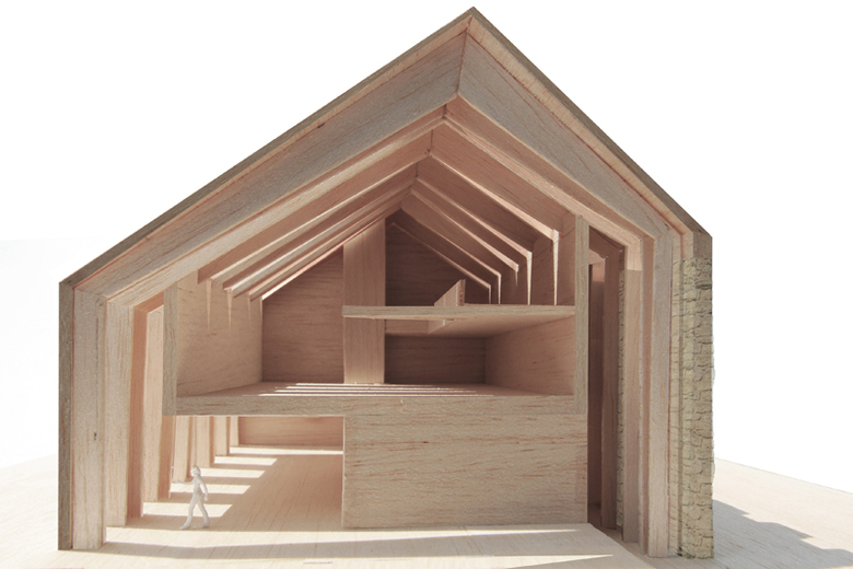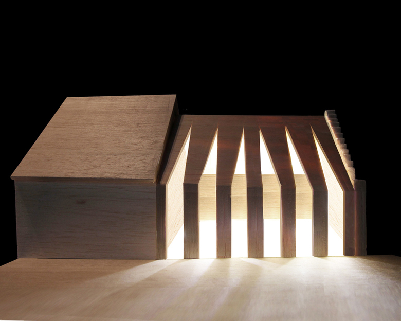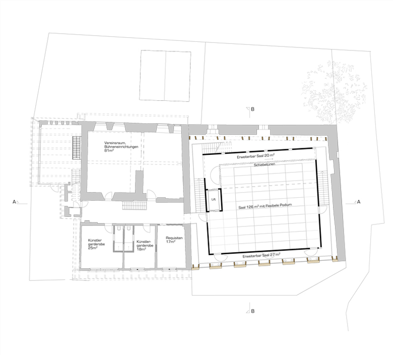 Der neue Saal wird im wahrsten Sinn als Kernstück in einer „Haus im Haus“ Konzeption unter der neuen Gebäudehülle eingebaut. Zenital belichtet und über zwei Seiten Erschlossen steht der neue Saal auf zwei Kuben und ist losgelöst von der primären Kreuzrippenkonstruktion. Die neue Aussenhülle besteht aus Lehm und Lehmziegel.