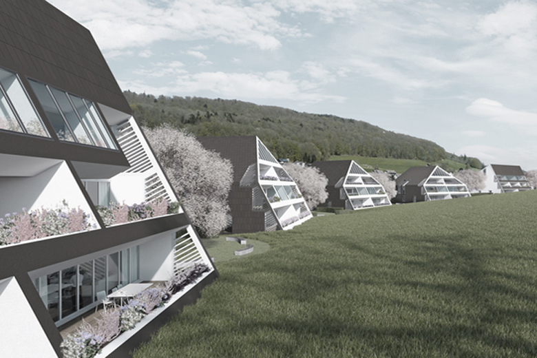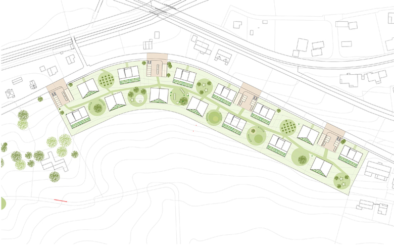 Die alternierende Anordnung der Baukörper verspricht eine maximale Freiheit der Aussenräume und demzufolge eine maximale Besonnungs- und Aussichtssituation sämtlicher Wohnungen. Zwischen den Häusern sind runde „Parkinseln“ mit unterschiedlicher Ausstattung angeordnet. Die Inseln werden als Spielinseln, als Grillinseln, als Leseinseln oder als Waldinseln mit Zwergbäumen zum spielen ausgestattet. Parkartig führt eine innere Fusswegerschliessung von Haus zu Haus und von Parkinsel zu Parkinsel. Damit soll ein weitläufiger Austausch der Bewohner erzielt werden. Indem die beiden Haustypen in einer regellosen und willkürlichen Abfolge angeordnet sind, soll die gesamte Anlage eine suburbane und dörfliche Stimmung ausstrahlen.